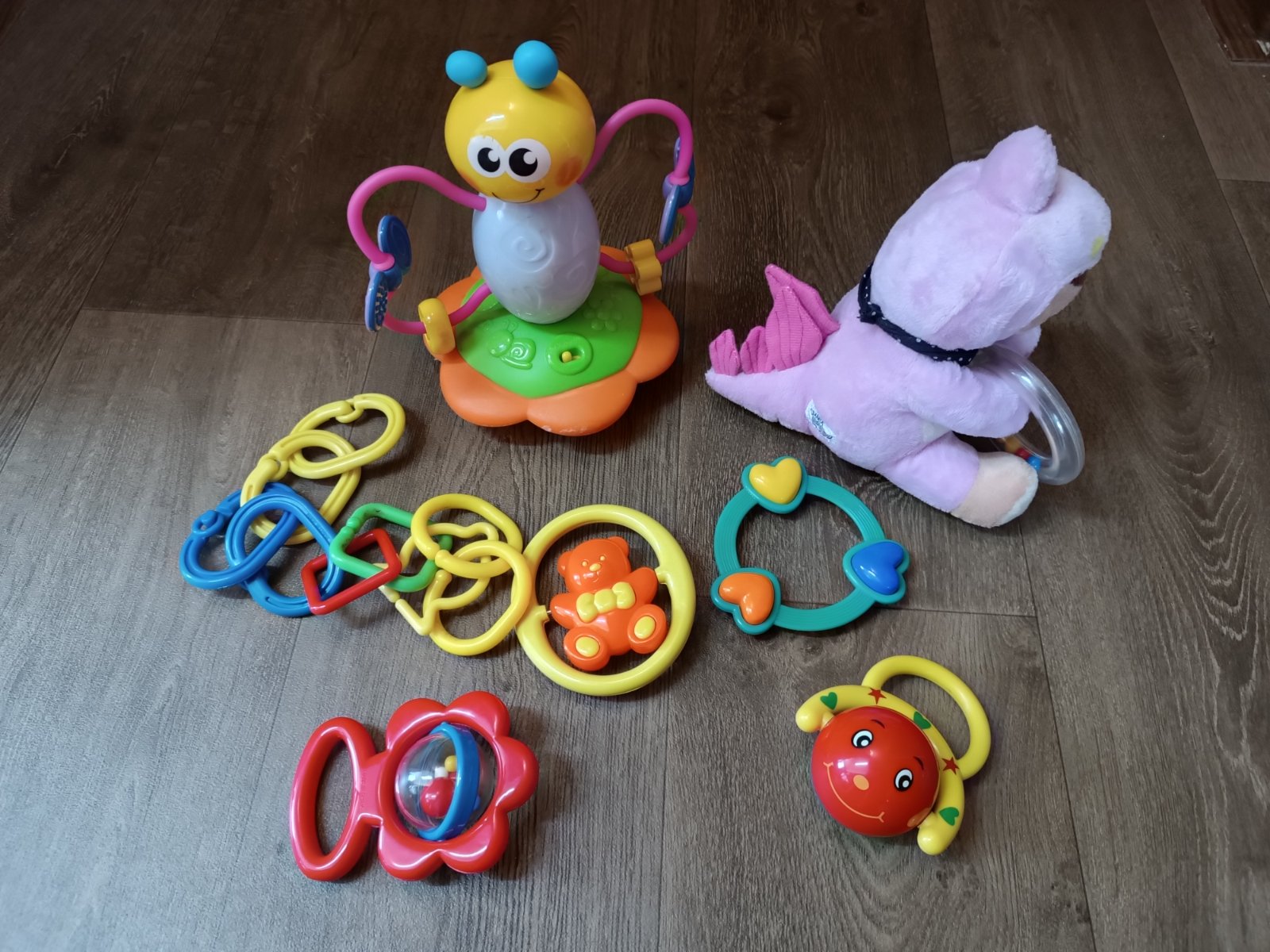 Prodám hračky pro nejmenší miminka. Sada retro chrastítek - stav nových - komplet za 200 Kč + interaktivní hračka ve tvaru motýla, na baterky, reaguje na dotyk dítěte - bliká, hraje, hlasitost lze regulovat - dva stupně hlasitosti, rodiče ocení. Věkově 12m +, přenechám za 150 Kč. Plyšák 2v1 s chrastítkem (pejsek s přehnutím do růžového dinosaura) k celku zdarma.