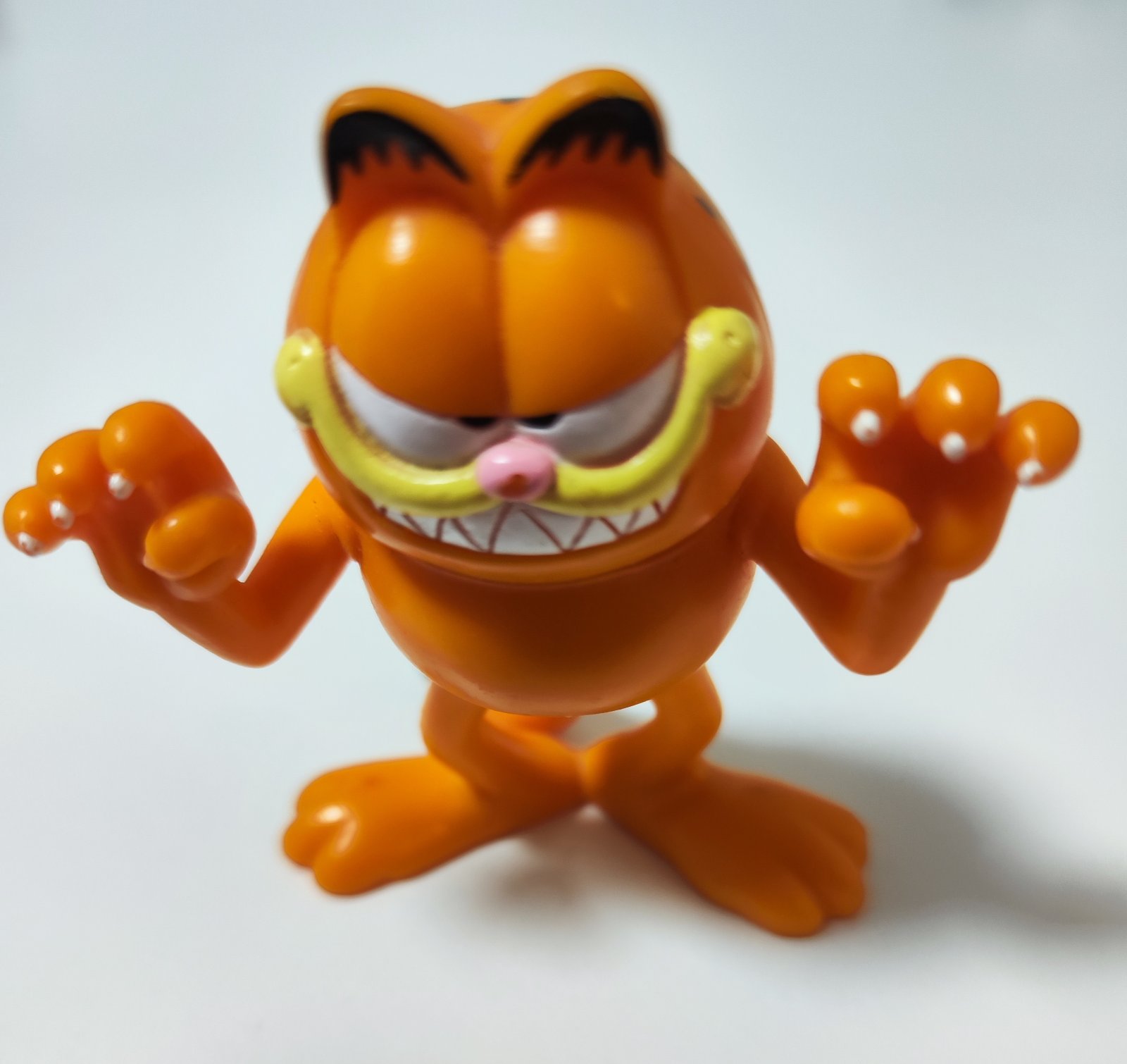 Prodám dvě plastové figurky Garfielda – klasická oranžová kočka s černými pruhy, každá v jiném stylu. Jedna v červeném oblečku s písmenem G, ruce založené, typicky znuděný výraz. Druhá s vyceněnými zuby a drápky, výrazně akčnější. Výška cca 9 cm. Cena 100 Kč, v Brně možné osobní předání.