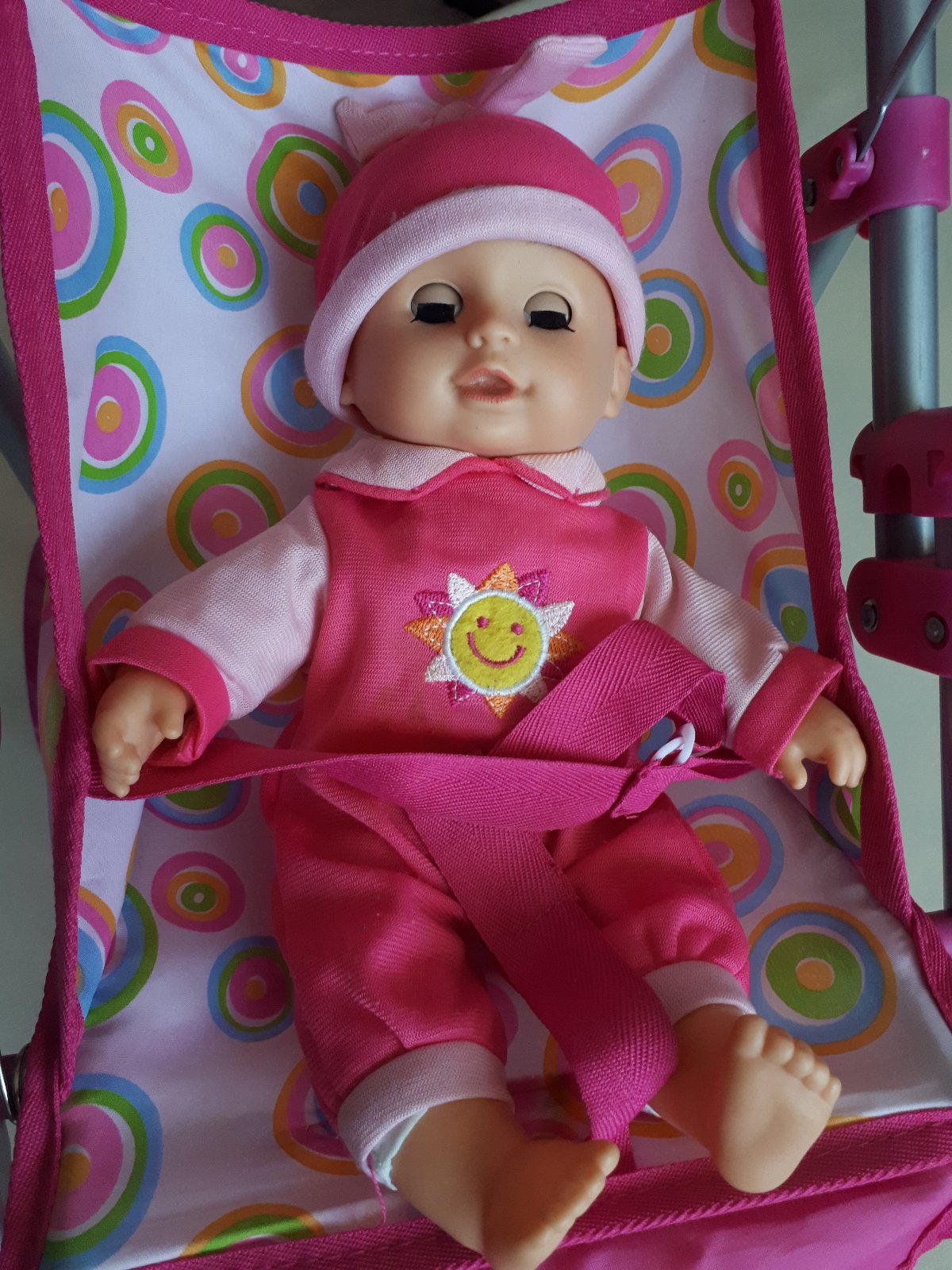 Prodám ve velice pěkném stavu kočárek - trojkolku s panenkou, která vydává různé zvuky. Velikost panenky 30cm.
