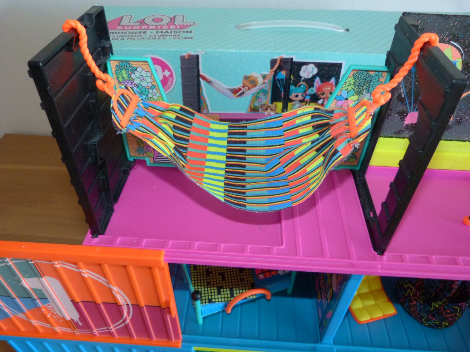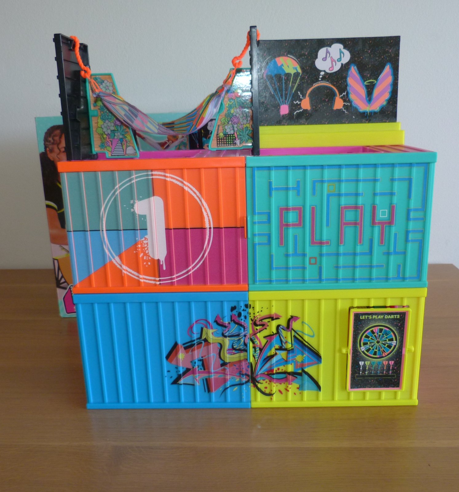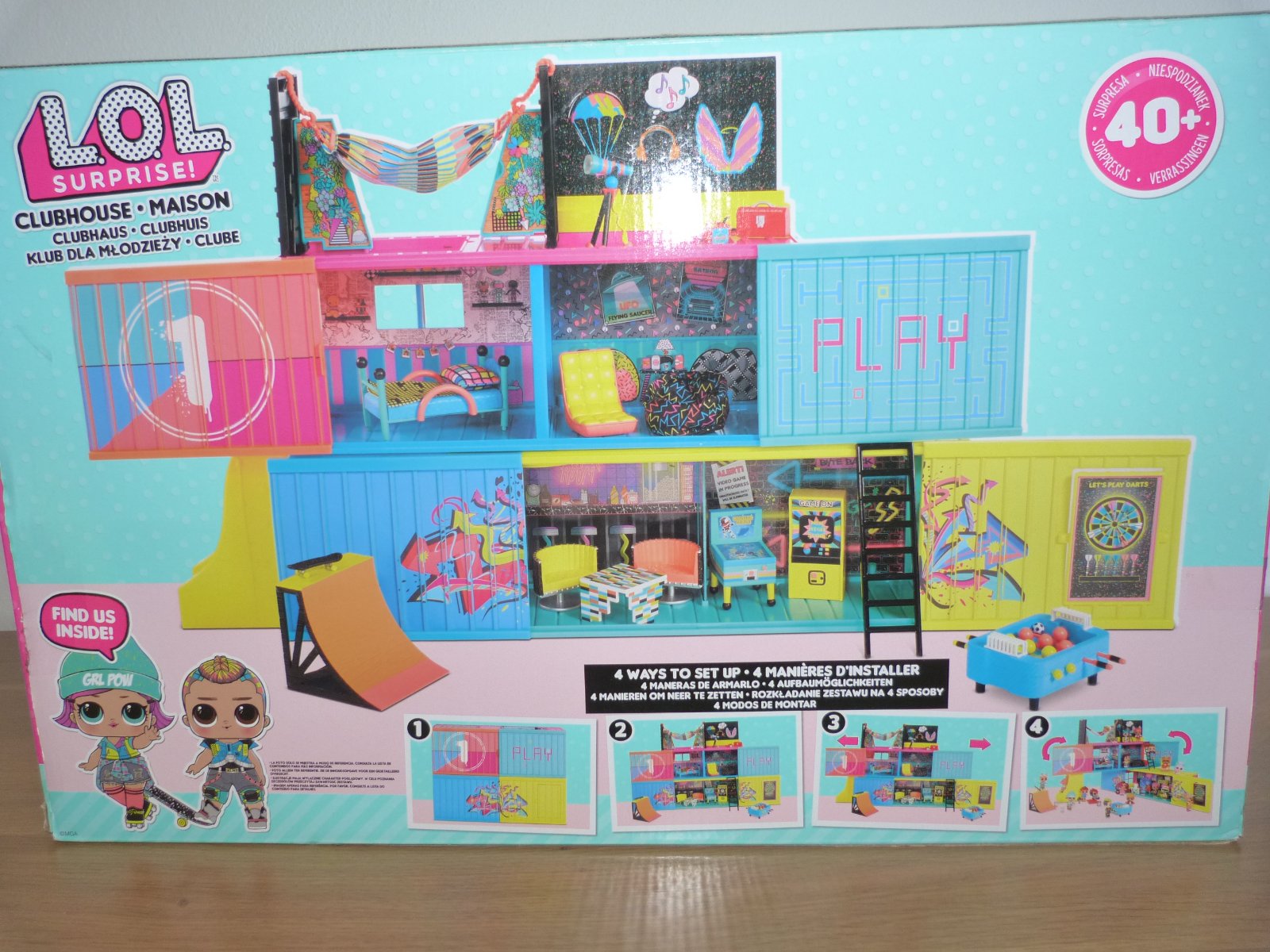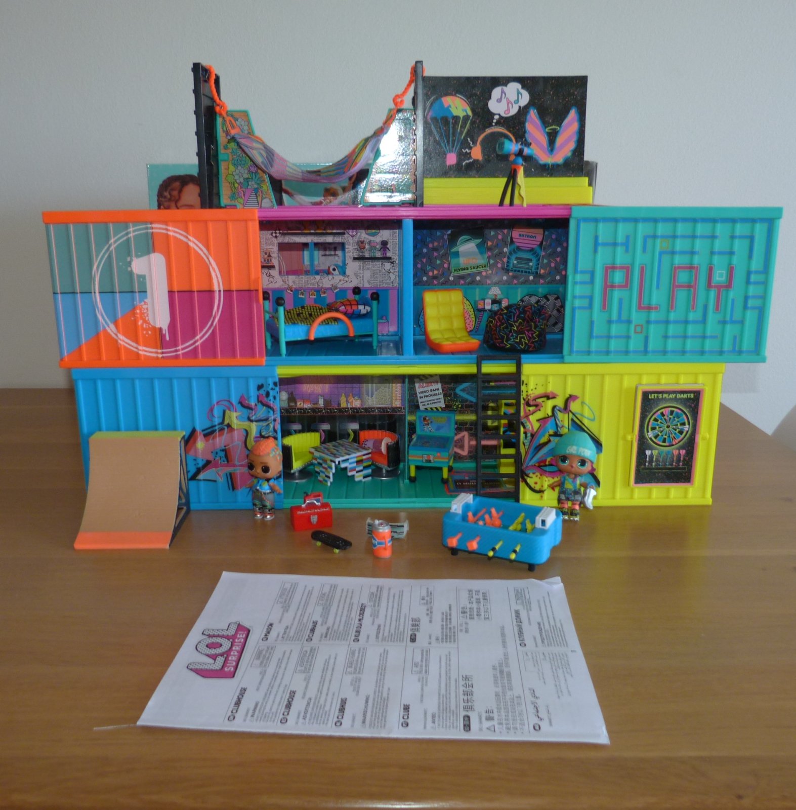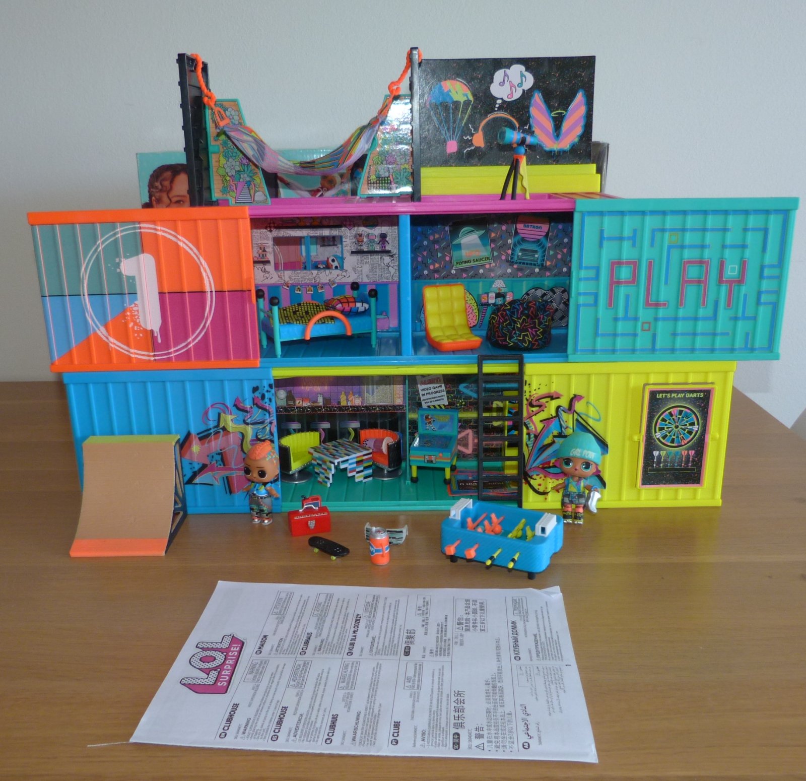 MGA L.O.L. SURPRISE Klubovna, v top stavu, 2 rozkládací kontejnery, ze kterých jde postavit třípatrovou klubovnu. S exkluzivním nábytkem, doplňky, jednou L.O.L. panenkou a jedním L.O.L. Klukem,nábytek, který zahrnuje skateboard rampu, houpací síť, skluzavku a mnoho dalšího, včetně originál krabice