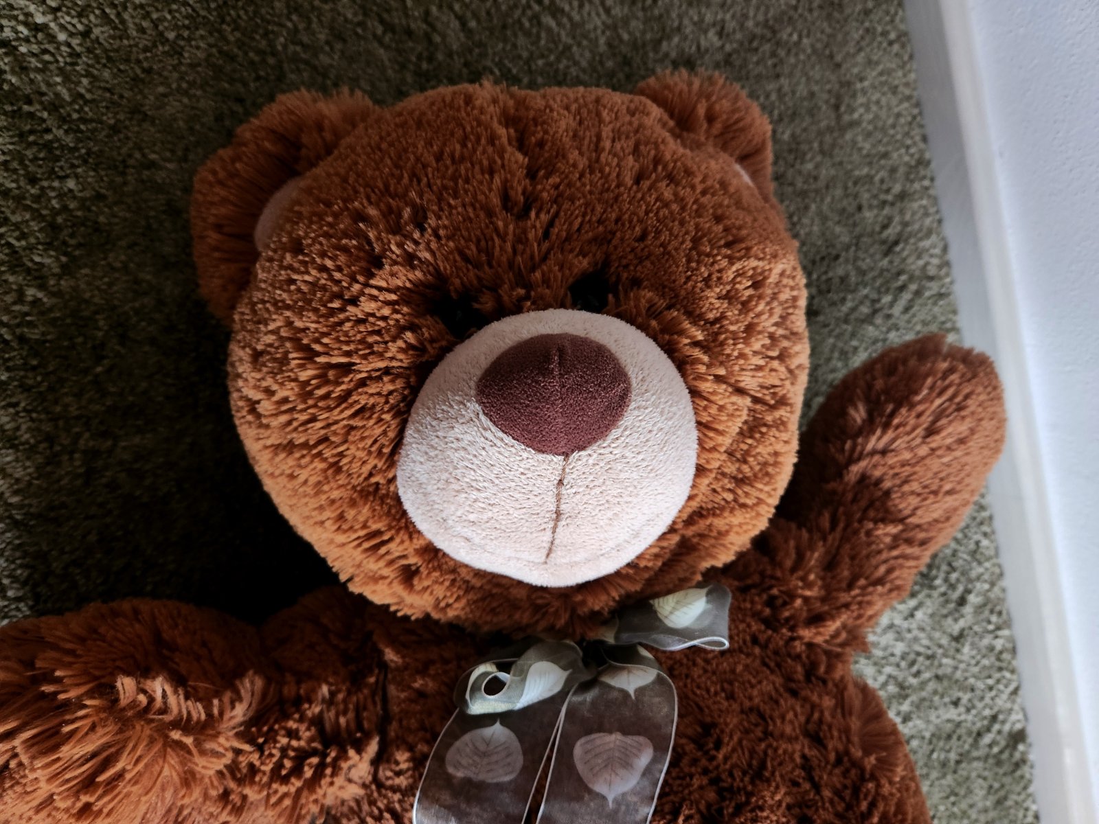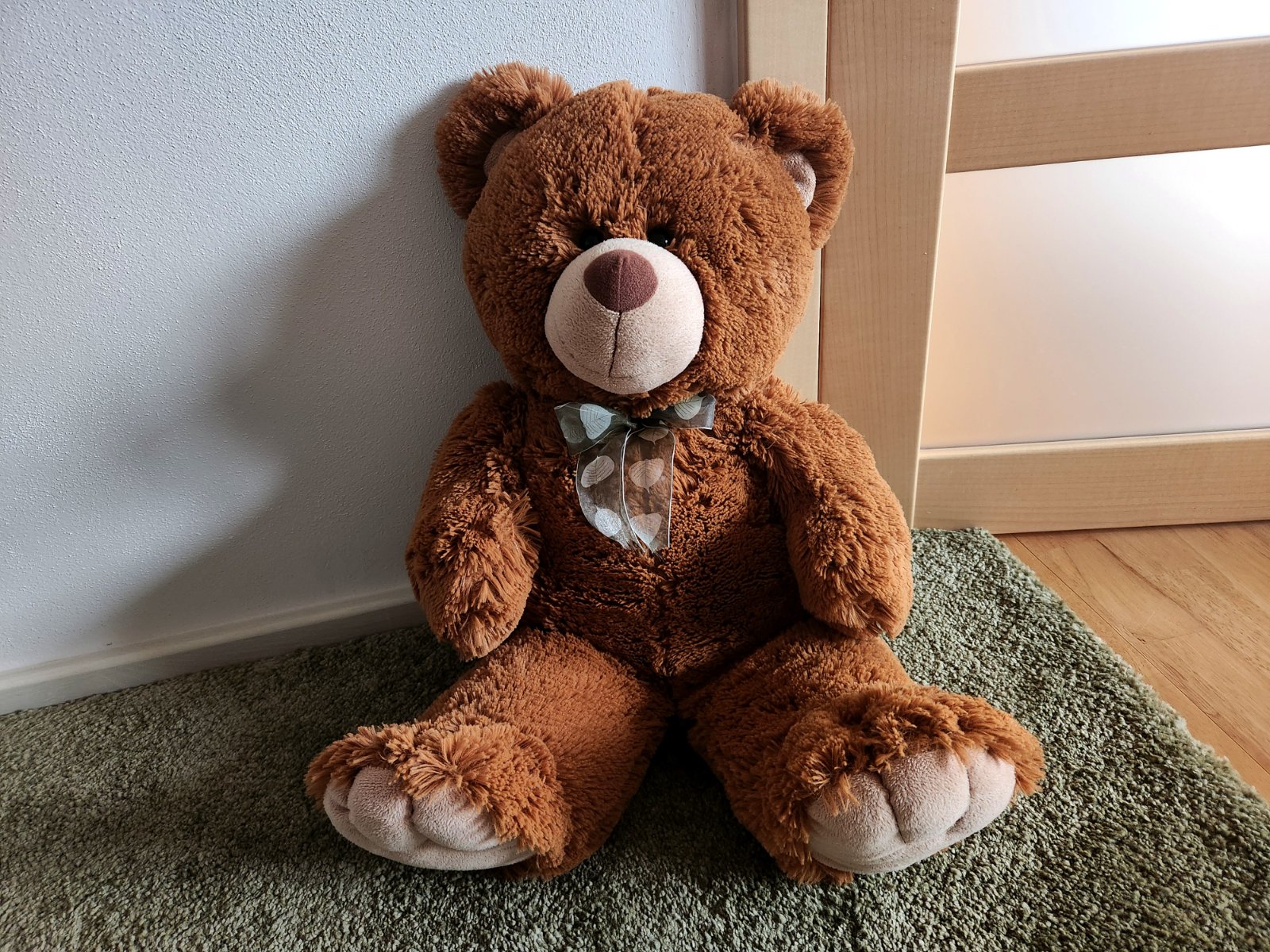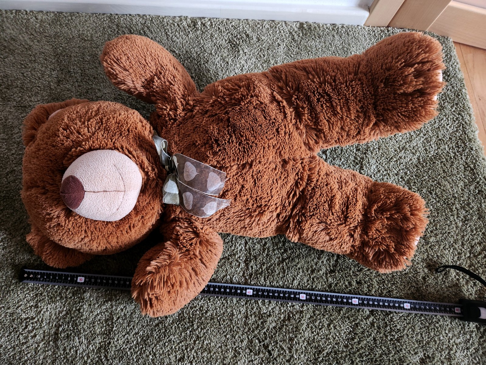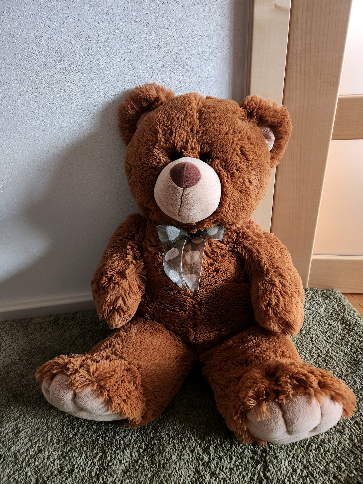 Veliký plyšový medvěd s mašlí. Měkká výplň, kuličková výplň v zadečku pro lepší stabilitu.