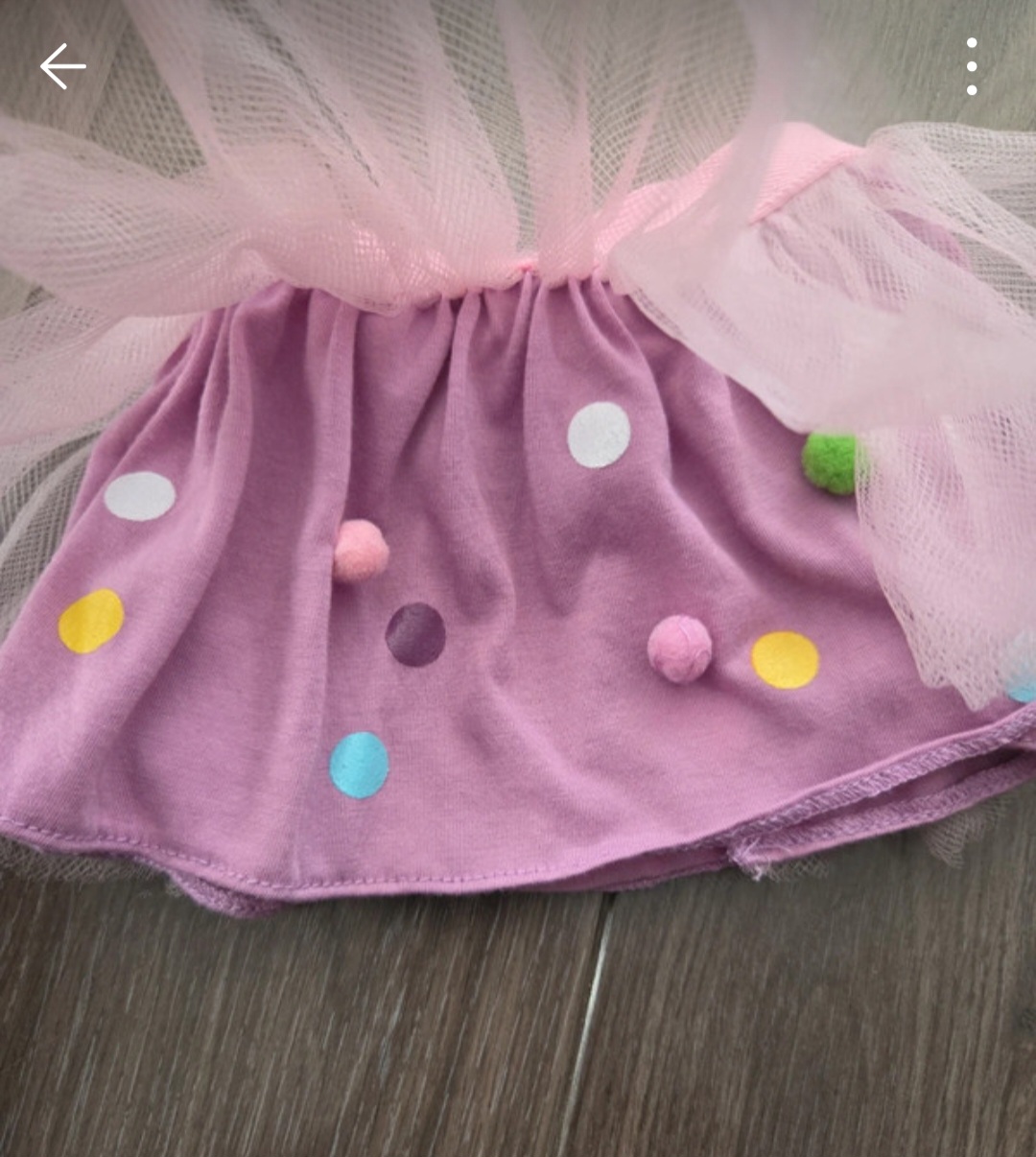 Šaty růžovo-černé, jsou na širší ramínka, zapínají se vzadu na zip a vázačku, mají řasení v horním dílu, zdobené černými kytičkami, lemované jsou ve výstřihu a na dolním lemu černým tylem pošitým s...