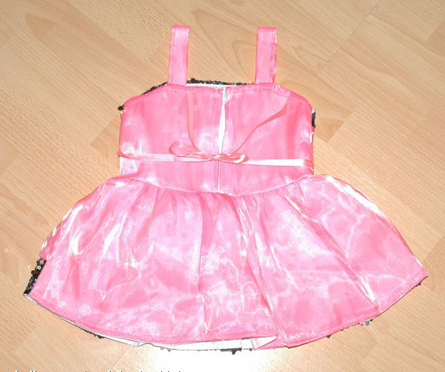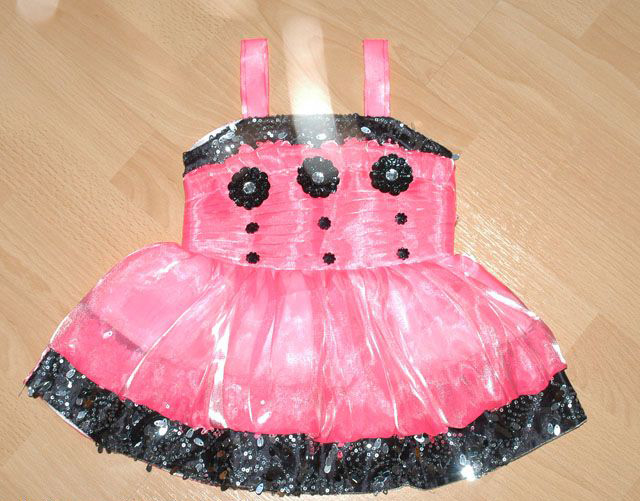 Šaty růžovo-černé, jsou na širší ramínka, zapínají se vzadu na zip a vázačku, mají řasení v horním dílu, zdobené černými kytičkami, lemované jsou ve výstřihu a na dolním lemu černým tylem pošitým stříbrnými flitry, sukýnka je šitá do balonového střihu, má krátkou podšívku, velikost odhaduji v reálu tak na cca 1 rok