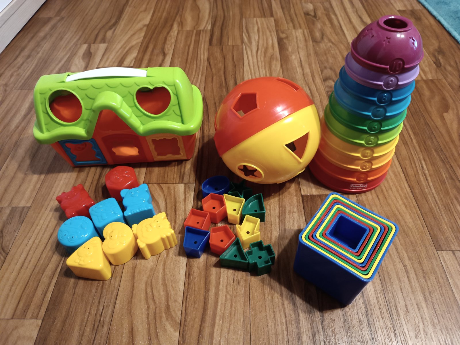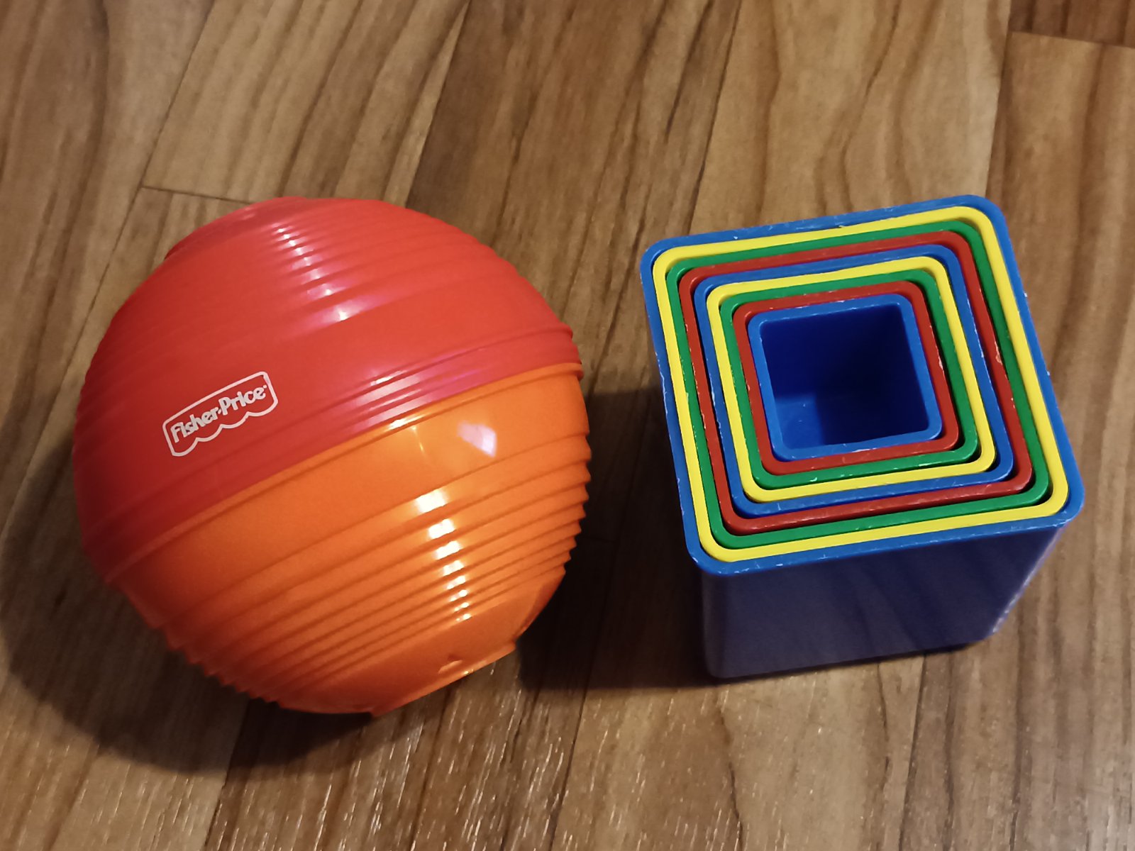 1)Skládačka Fisher Price - se skládá z 10ti barevných očíslovaných mističek. Děti mohou mističky skládat na sebe nebo je vzájemně do dvojic spojit a kutálet je po zemi jako míček nebo vzájemně propojit do zeměkoule, chybí rolnička. - 60 Kč
