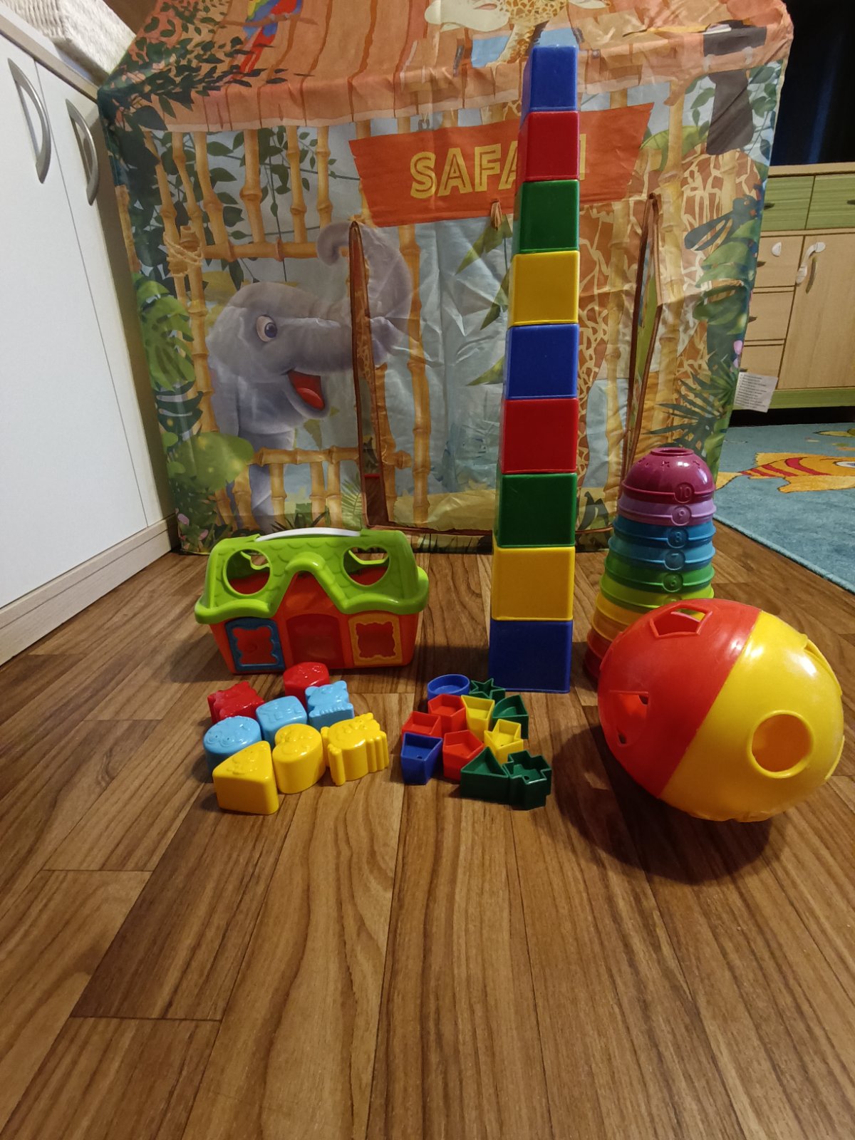 4)Vkládací domeček, jeden červený tvar se nám, bohužel, někam zatoulal. Kupováno v hračkárně Dráčik, PC: 200 Kč, pěkný stav, nyní 80 Kč.