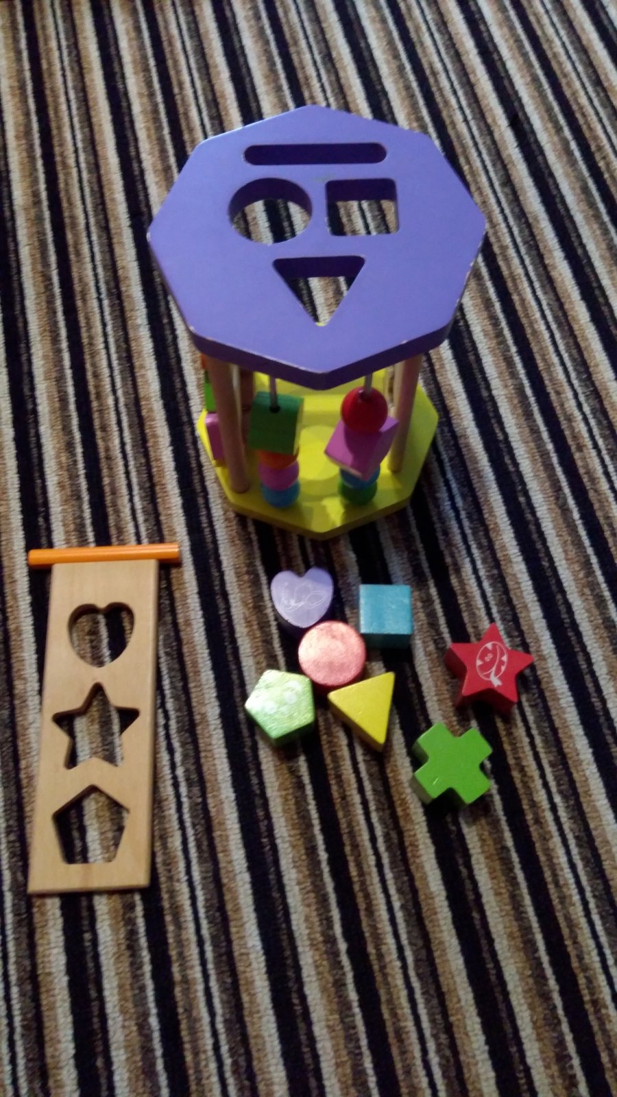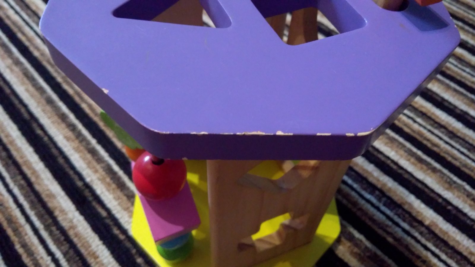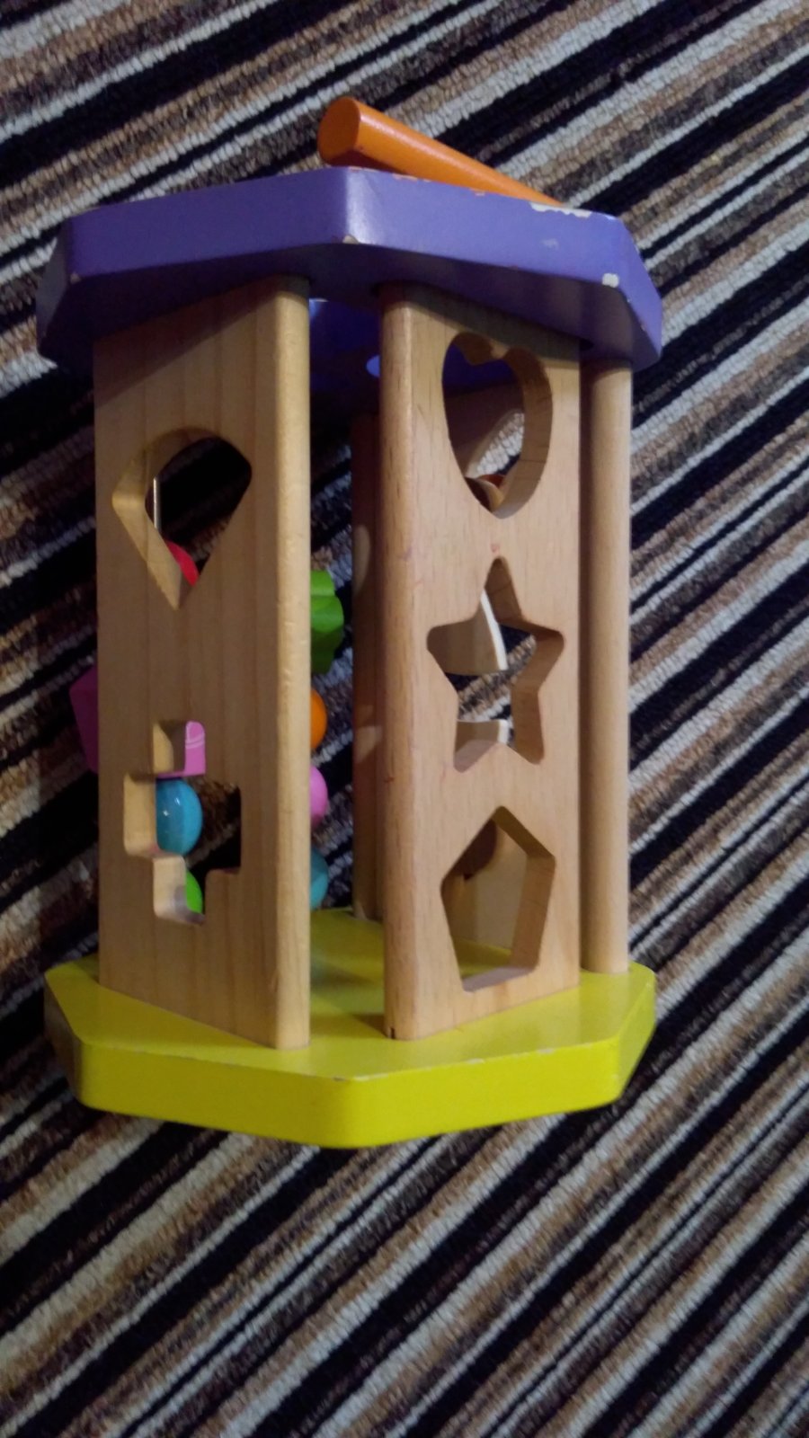 Moc hezká a barevná vkládačka, díky více prvkům rozvíjí motoriku, na spodní straně je zrcátko, horní hrana je místy odřená - viz. foto