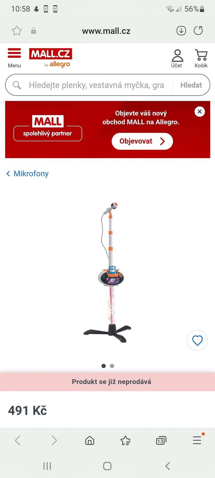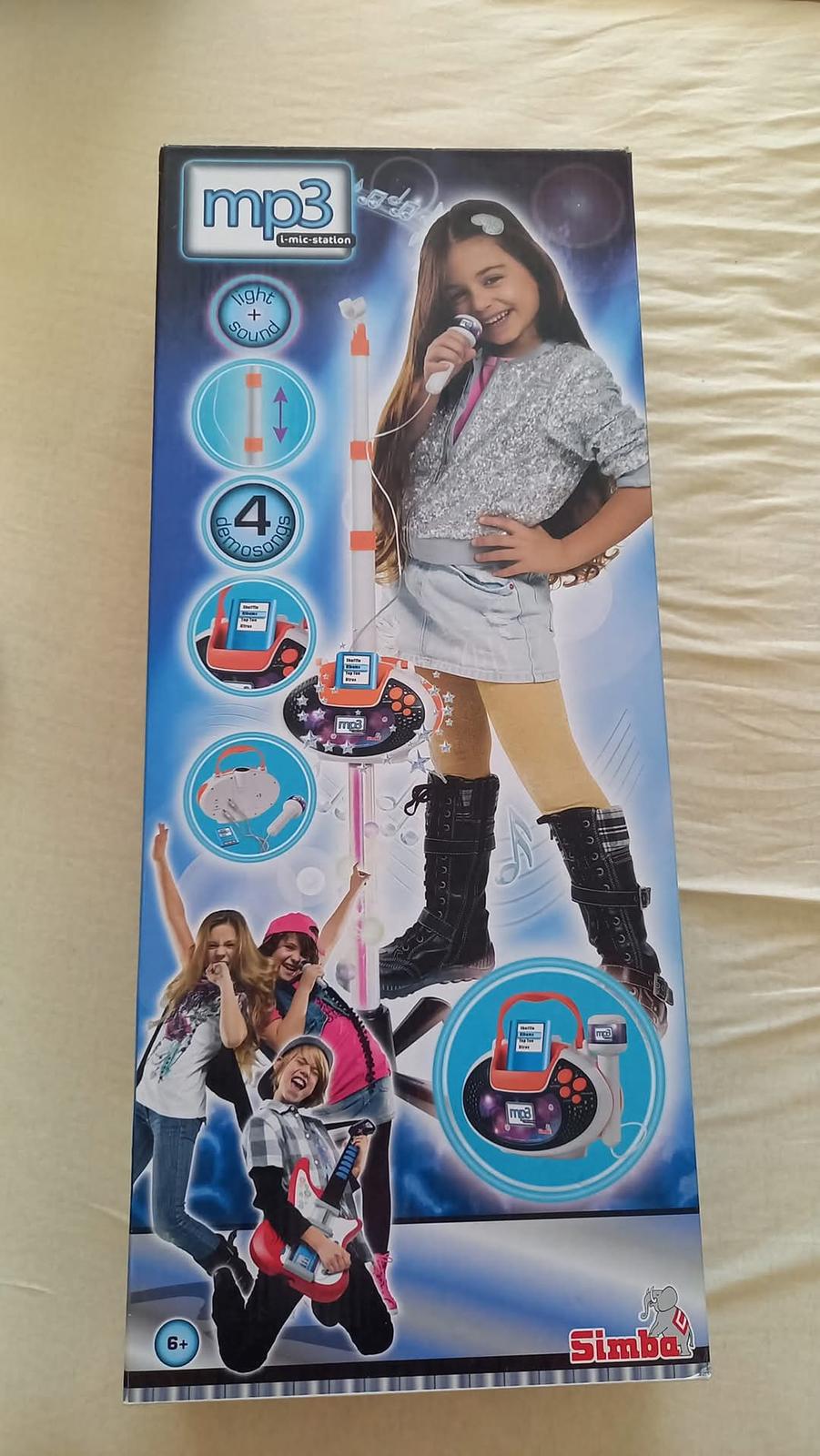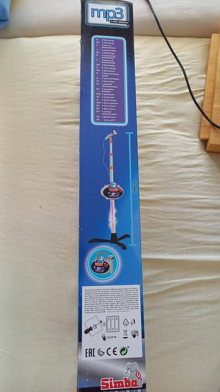 Prodám mikrofon se stojanem s možností i pro MP3. Lze pustit i přednastavené rytmy či potlesk. Používané, ale nezničené. Pouze jedna nožička stojánku je hodně odřená. Je to hračka, takže nelze čekat super zvuk z mikrofonu. Mikrofon je potřeba mít hodně blízko pusy.