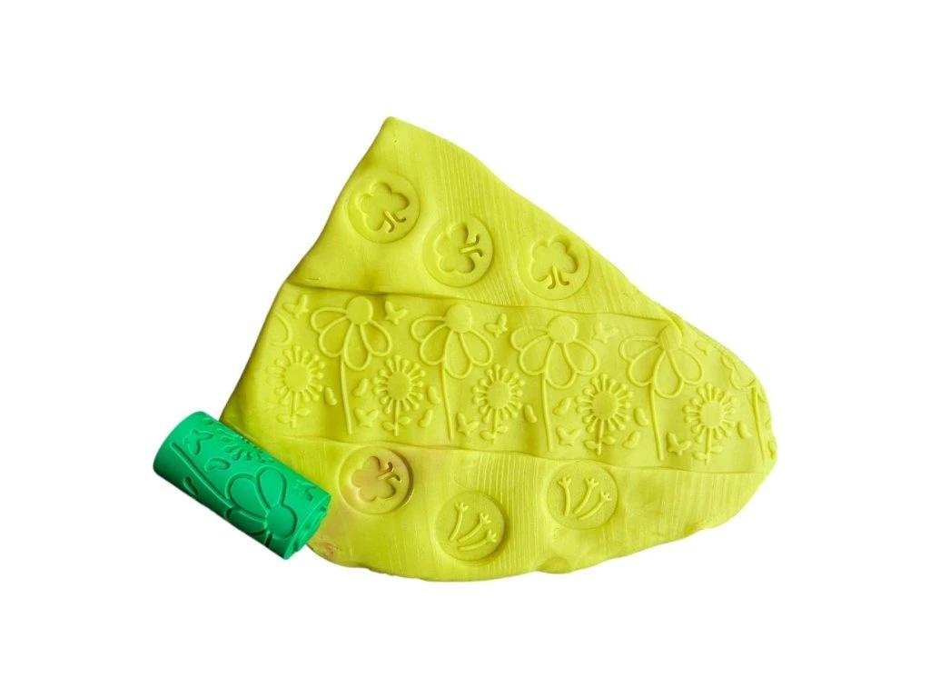 Otiskávací váleček je vhodný jako doplněk k plastelíně, kinetickému písku a k podobným hmotám.