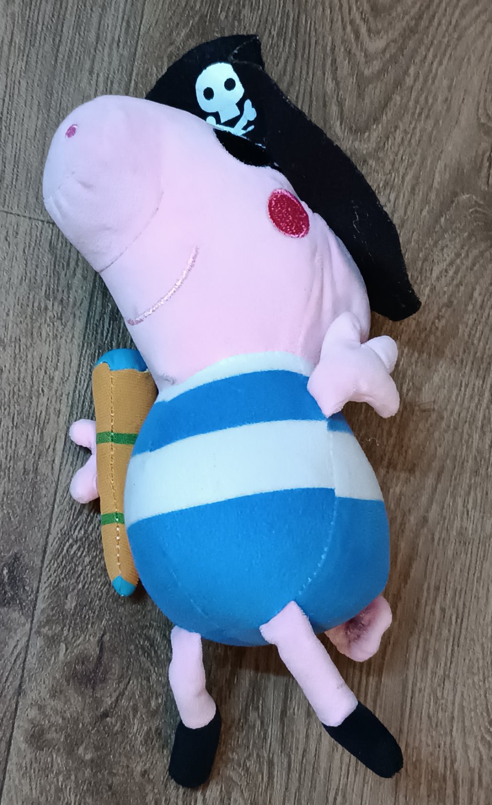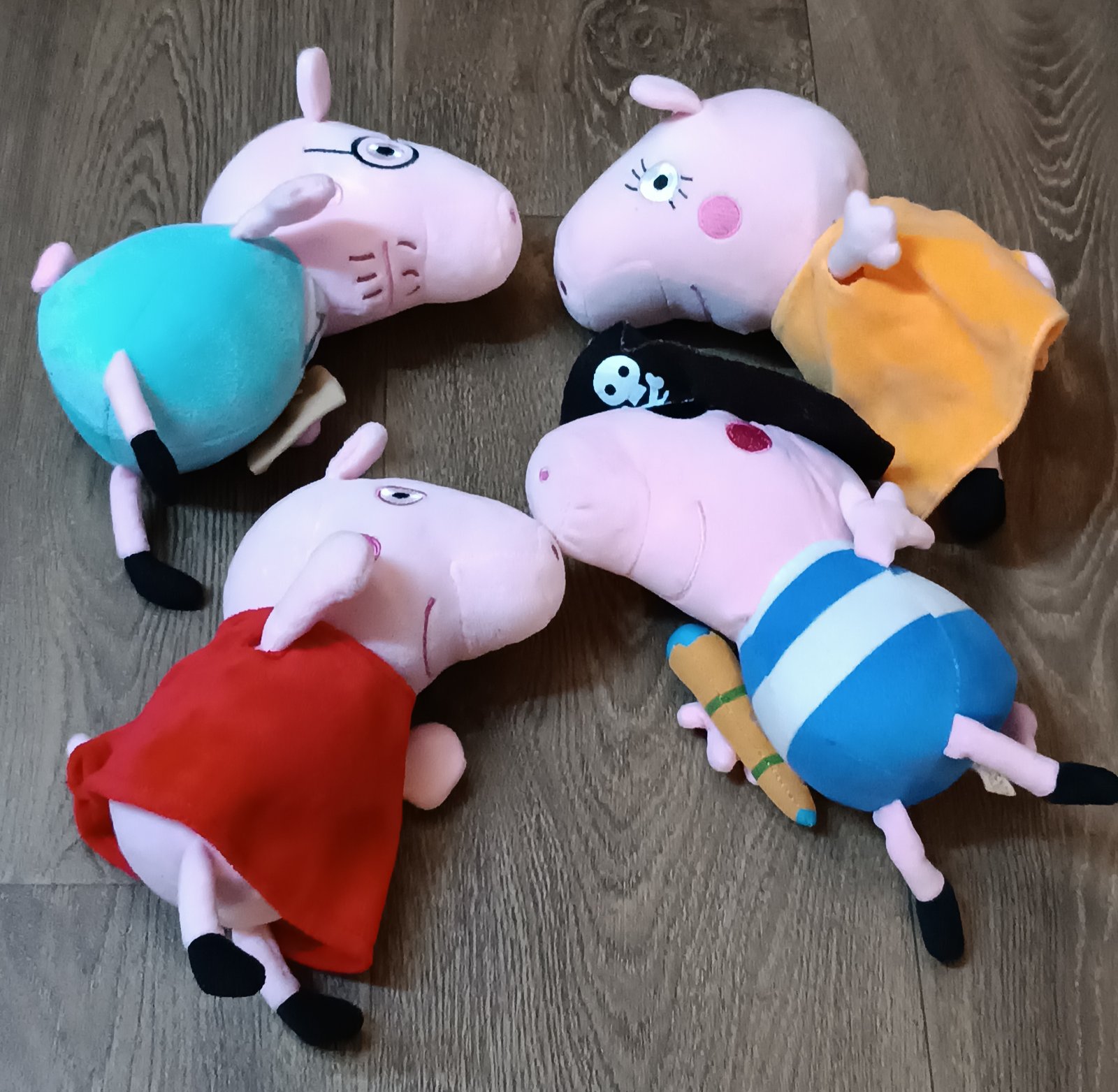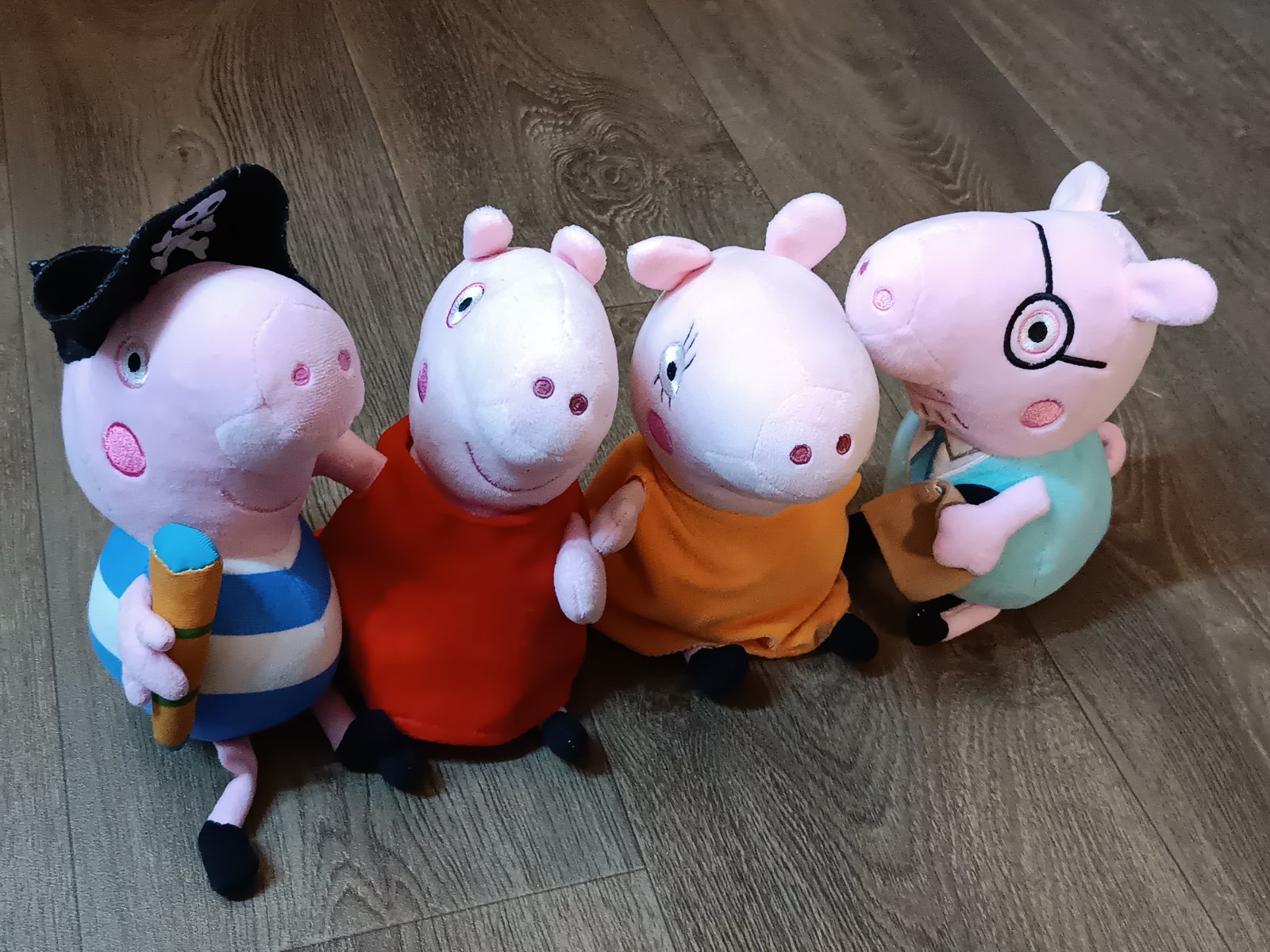 prasátko Peppa, prasátko Tomík, maminka a tatínek. Hraný pouze pirát Tomík, ostatní pouze vystavené, výška každého člena rodinky je 25 cm, cena za všechny.