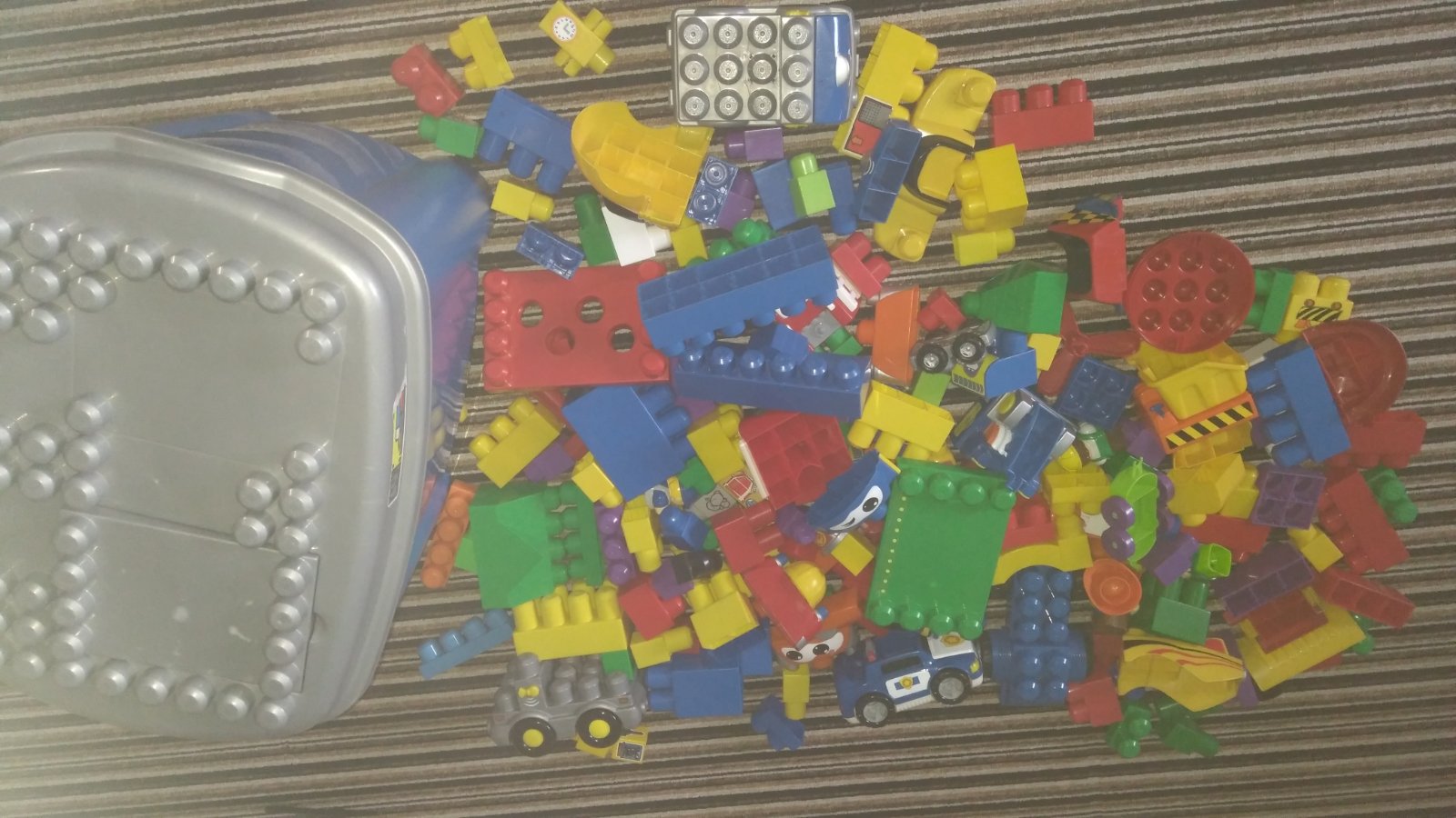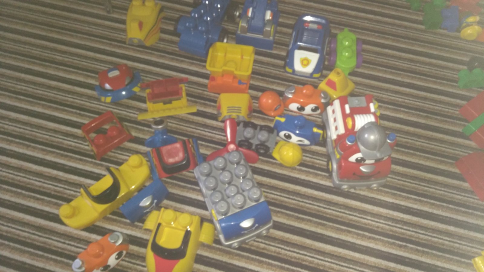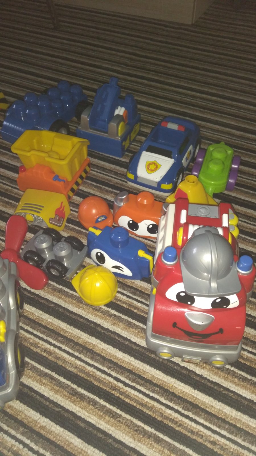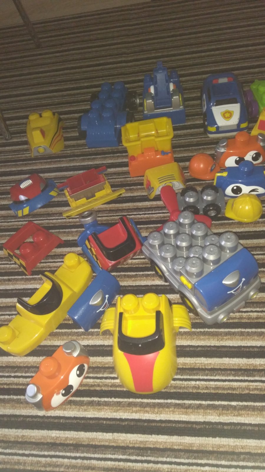 Spoustu dílů včetně velkého boxu, součástí jsou zvířata, postavičky, podvozky aut s příslušenstvím ze kterého lze postavit různé typy aut, auta původně vydávala zvuky ( bohužel u některého vytekly baterie), jednoz aut ještě troubilo....třeba se to povede šikovné mu tatínkovi opravit. Vzhledem k tomu že dílků je opravdu hodně a box je velký, prosím, počítejte s vyšším poštovným