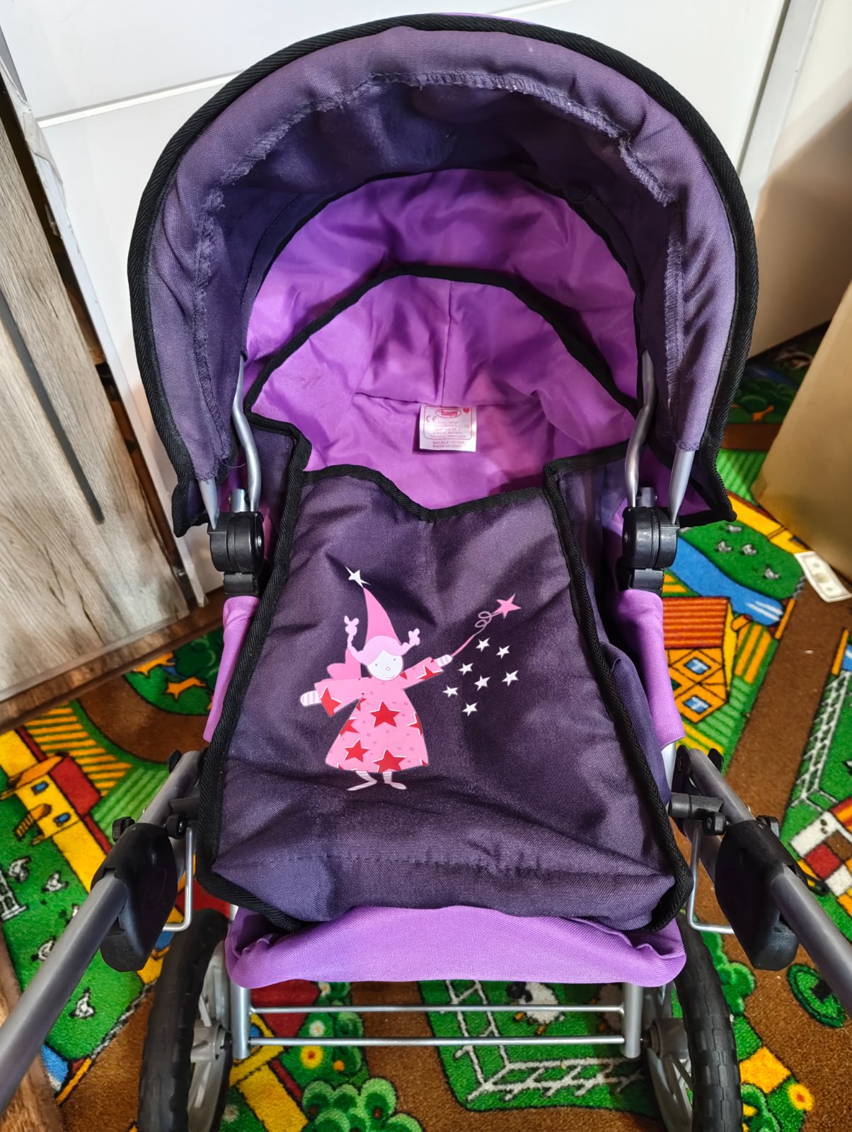 Starší kočárek pro panenky, rukojeť cca až 75cm, takže vhodný i pro větší holčičku, známky použití, odřeniny, potah ušpiněný, konstrukce trochu nahnutá k jedné straně (u houpacích kočárku běžná věc...