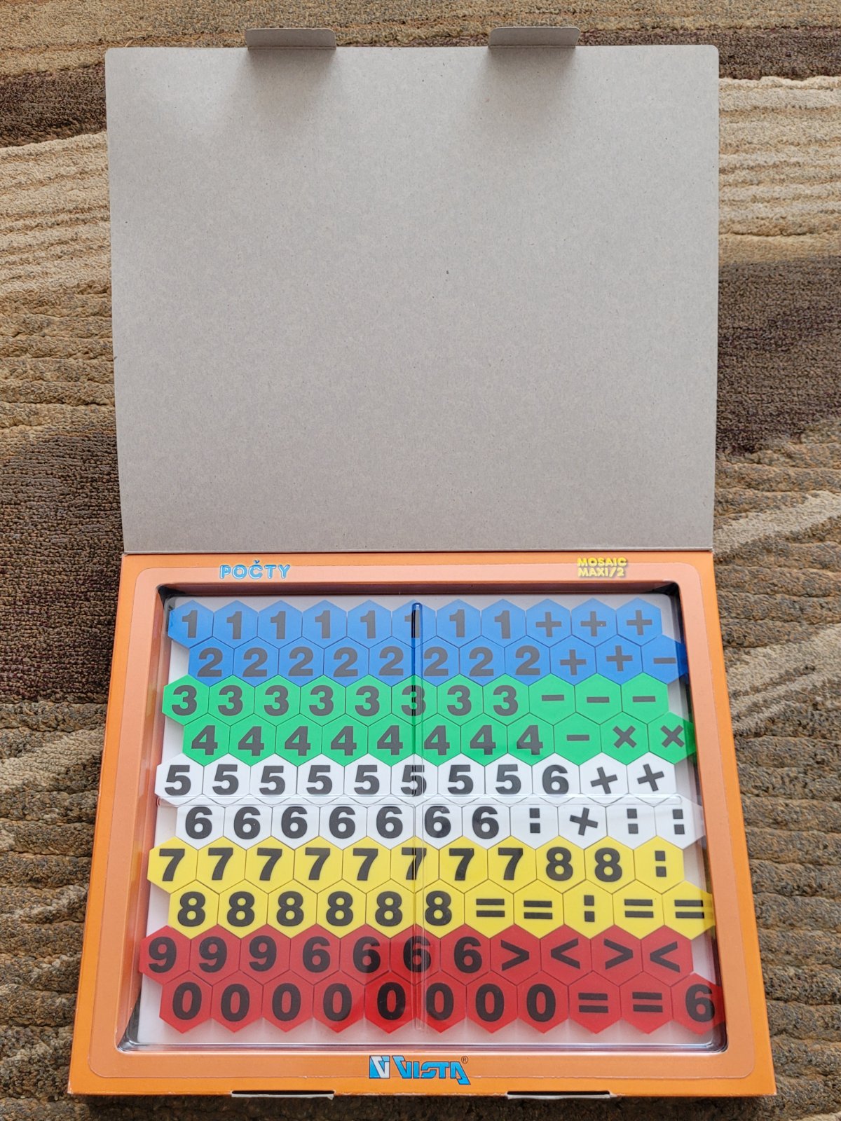 Vzdělávací mozaiková sada od značky Vista, která pomáhá dětem zábavnou formou s učením základů počítání. Sada obsahuje 110 dílků v 5 barvách (žlutá, červená, zelená, modrá, bílá) s čísly a početními znaménky. Sada je určena dětem od 4 let, může posloužit k procvičování základního počítání, logického myšlení a trpělivosti.