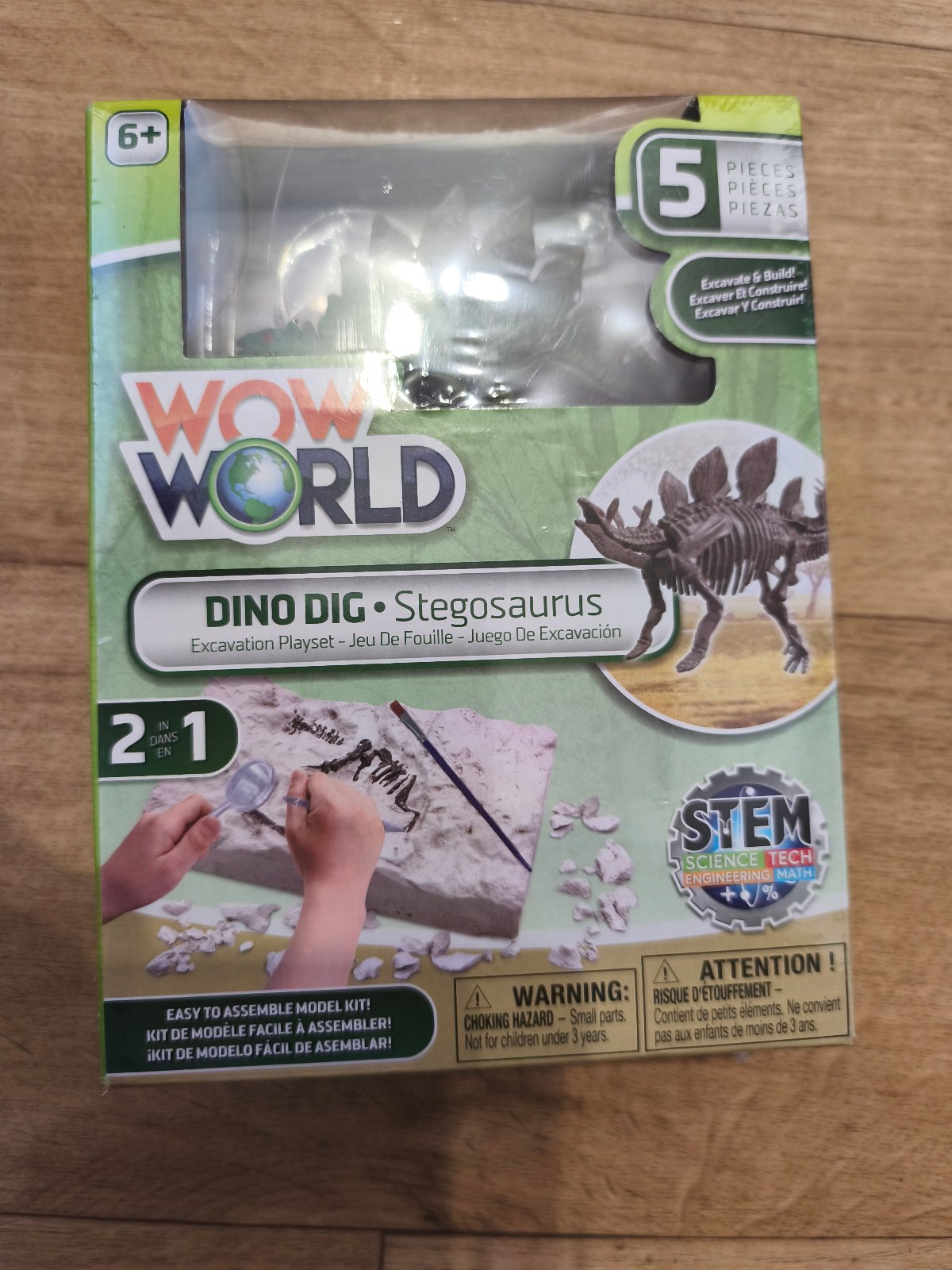 Obsahuje figurku stegosaura + sádrovou hmotu s kostrou + dláto + šteteček.