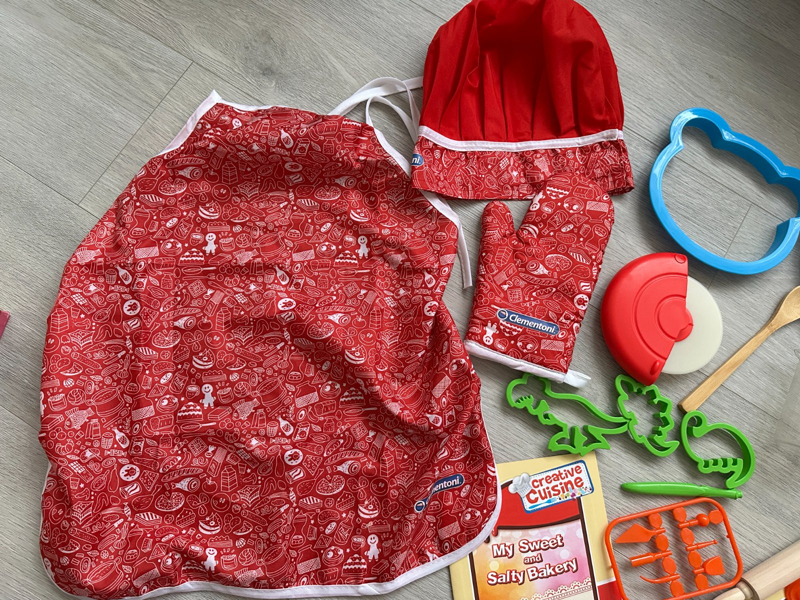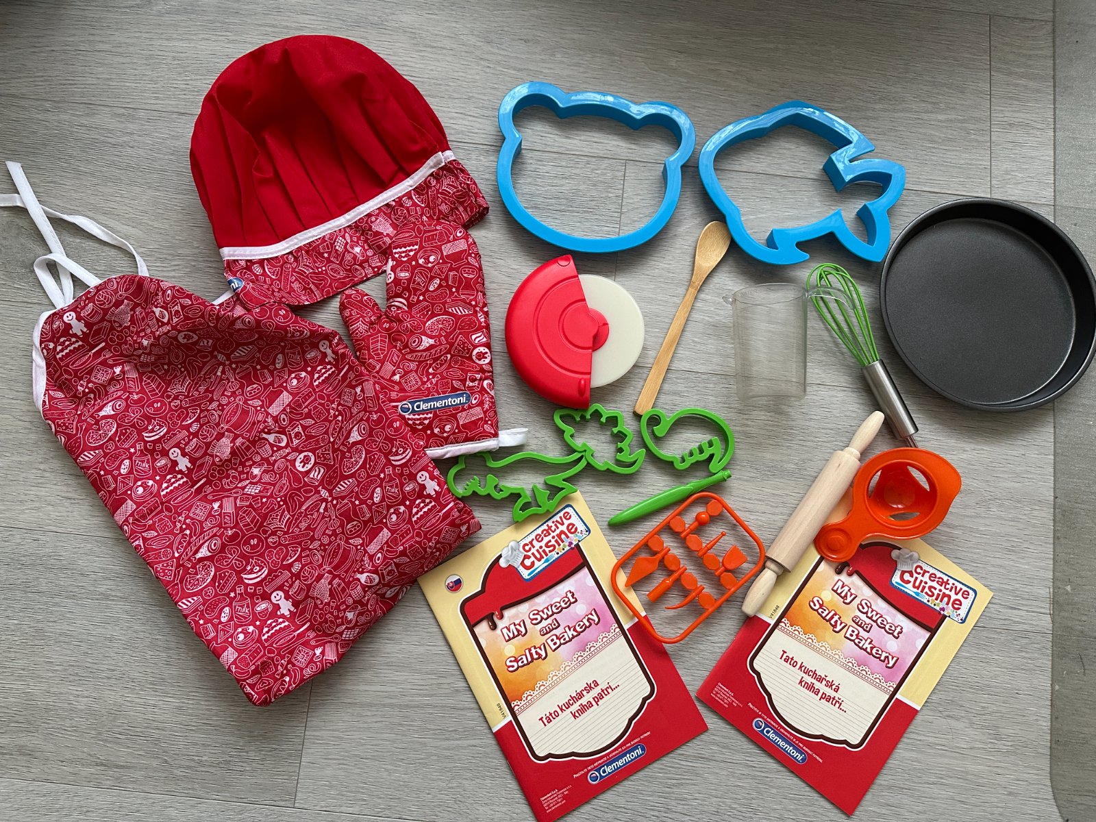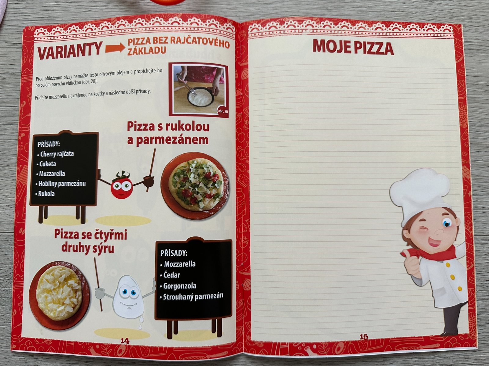 - obsahuje: formičky na pizzu, odměrku, zástěru, kuchařskou čepici, rukavici, váleček, vařečku, plech, kolečko na krájení pizzy a kuchařku