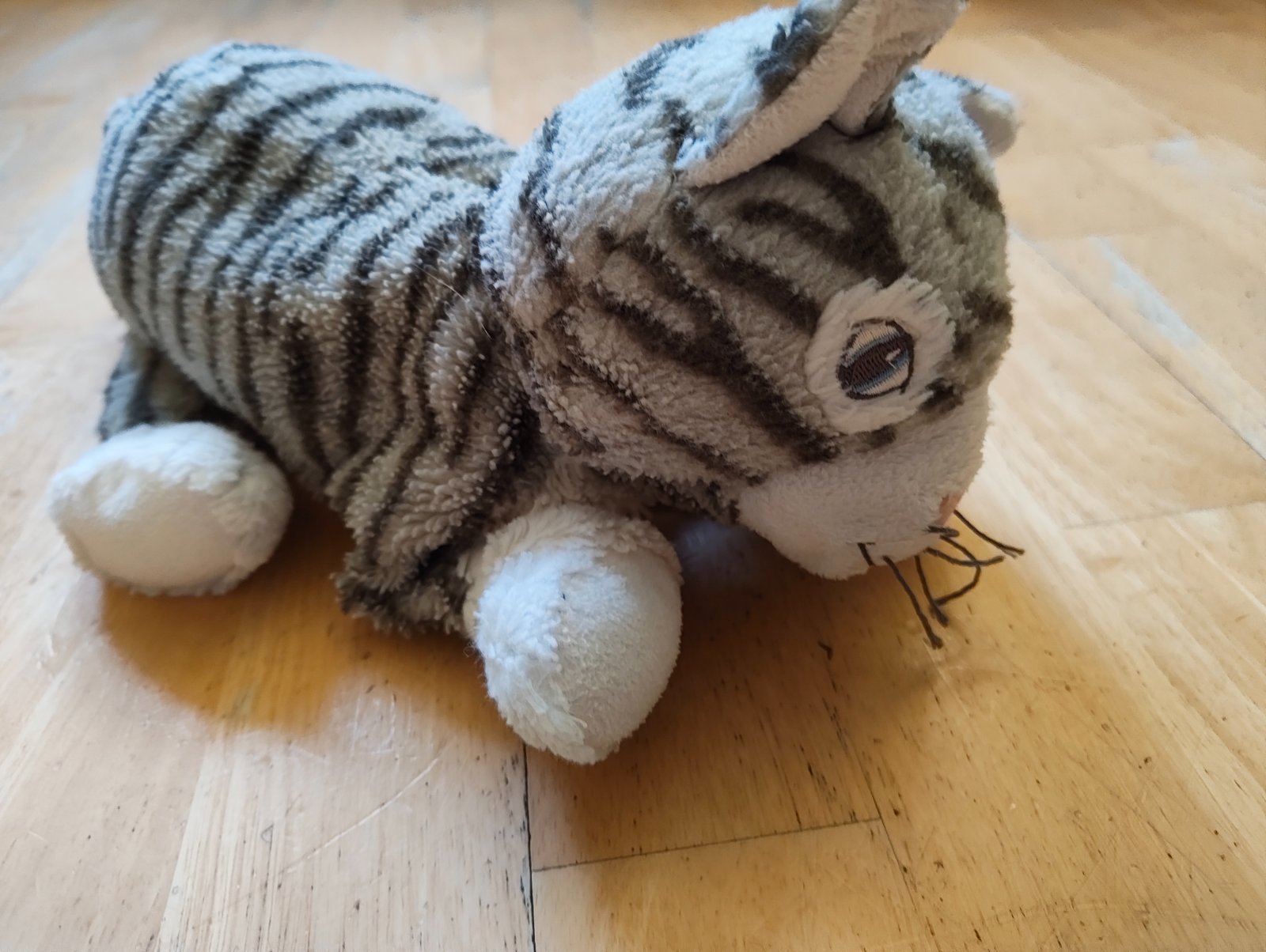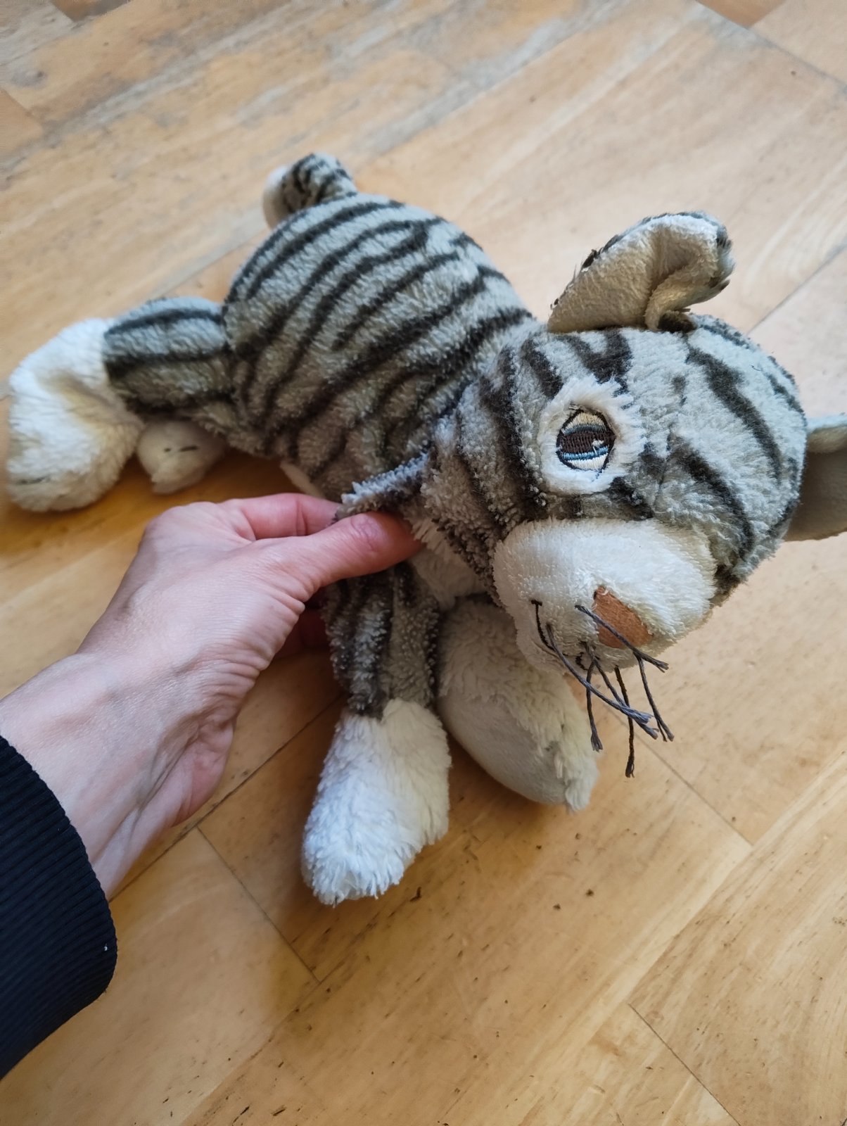 kupovaná před více jak 15 lety, nějaký čas uložená v krabici a teď není kam dát., má 40 cm, včetně stojánku nemá jedny řasy