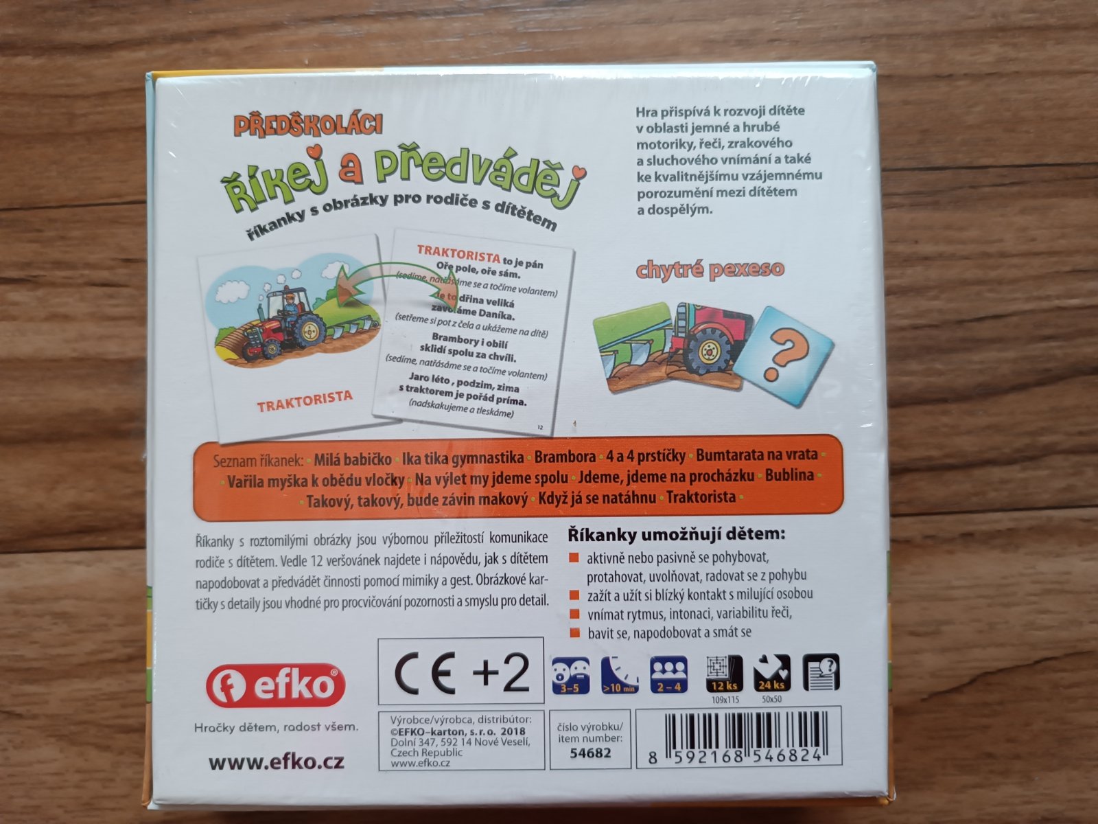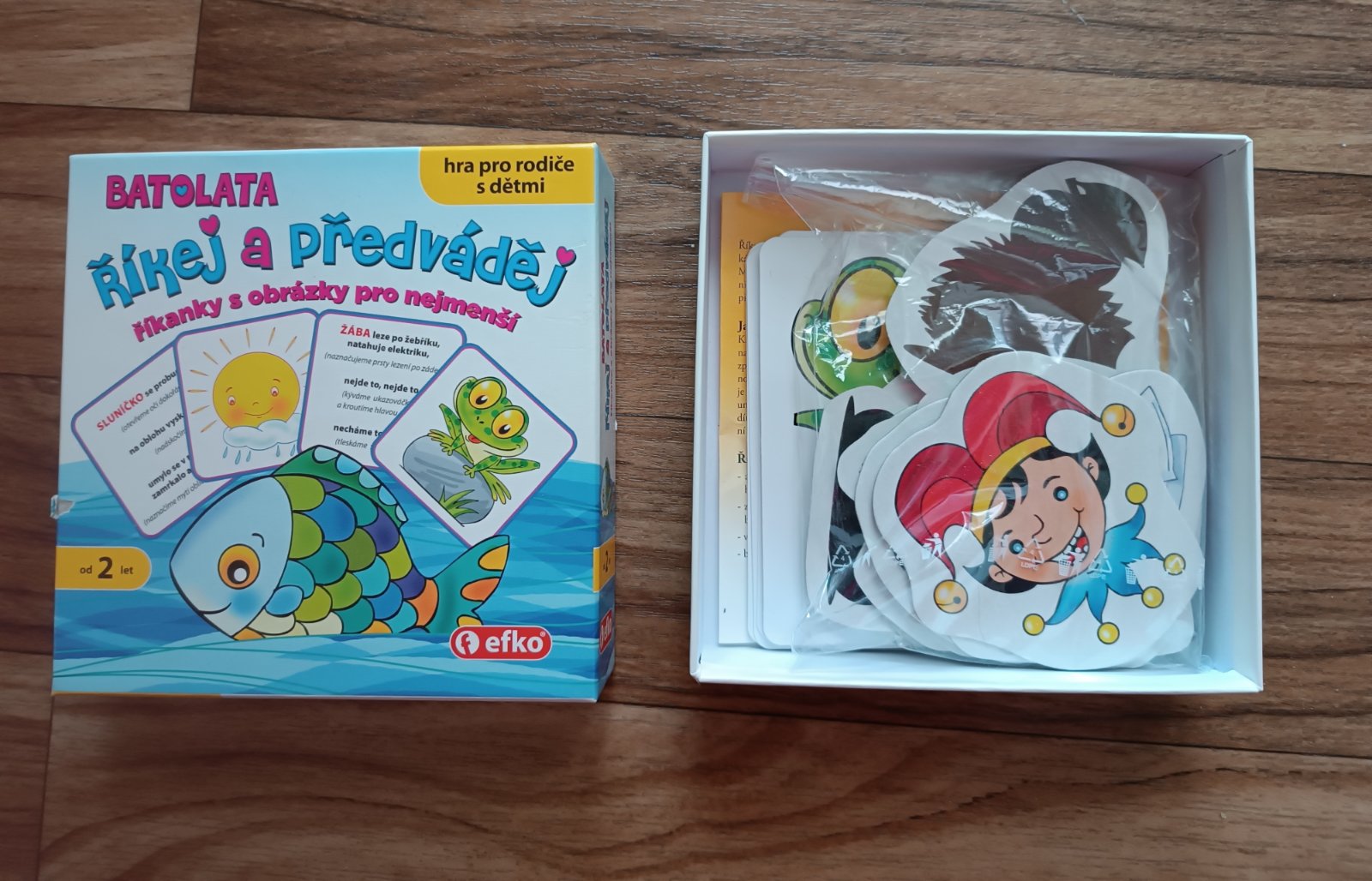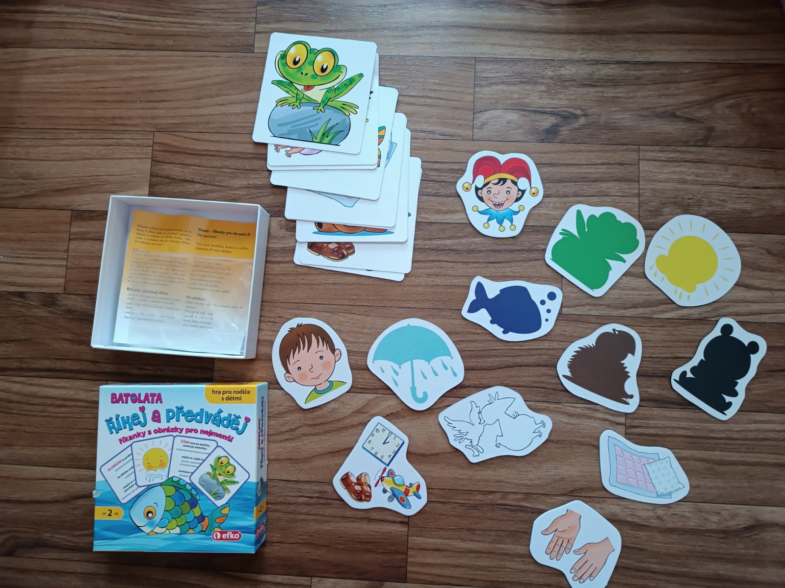 1) Hra pro batolata a (pra)rodiče, od cca 2 let, hra obsahuje kompletní balení včetně návodu, 12 oboustranných kartiček (na jedné straně barevný obrázek, na druhé straně říkanka), 12 motivů (obrázky a na druhé straně jejich stíny). Seznam jednotlivých básniček je na zadní straně hry. Hraná asi 2x, stav jako nová.