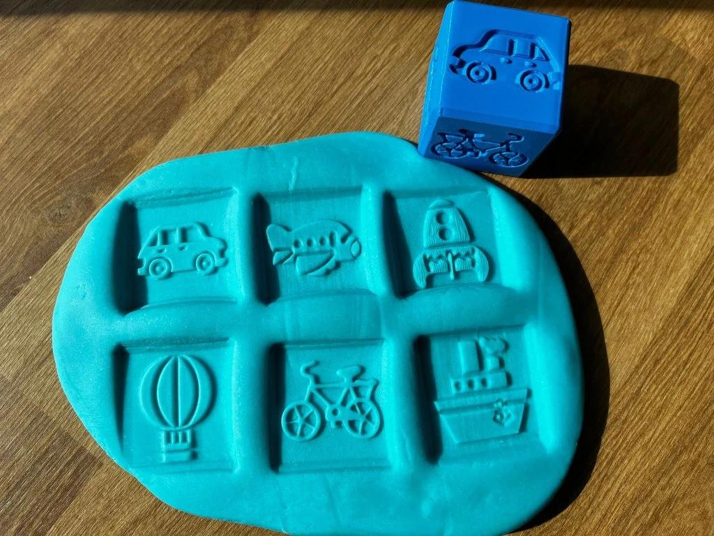 Otiskávací kostka je vhodná jako doplněk k plastelíně, kinetickému písku a k podobným hmotám.
