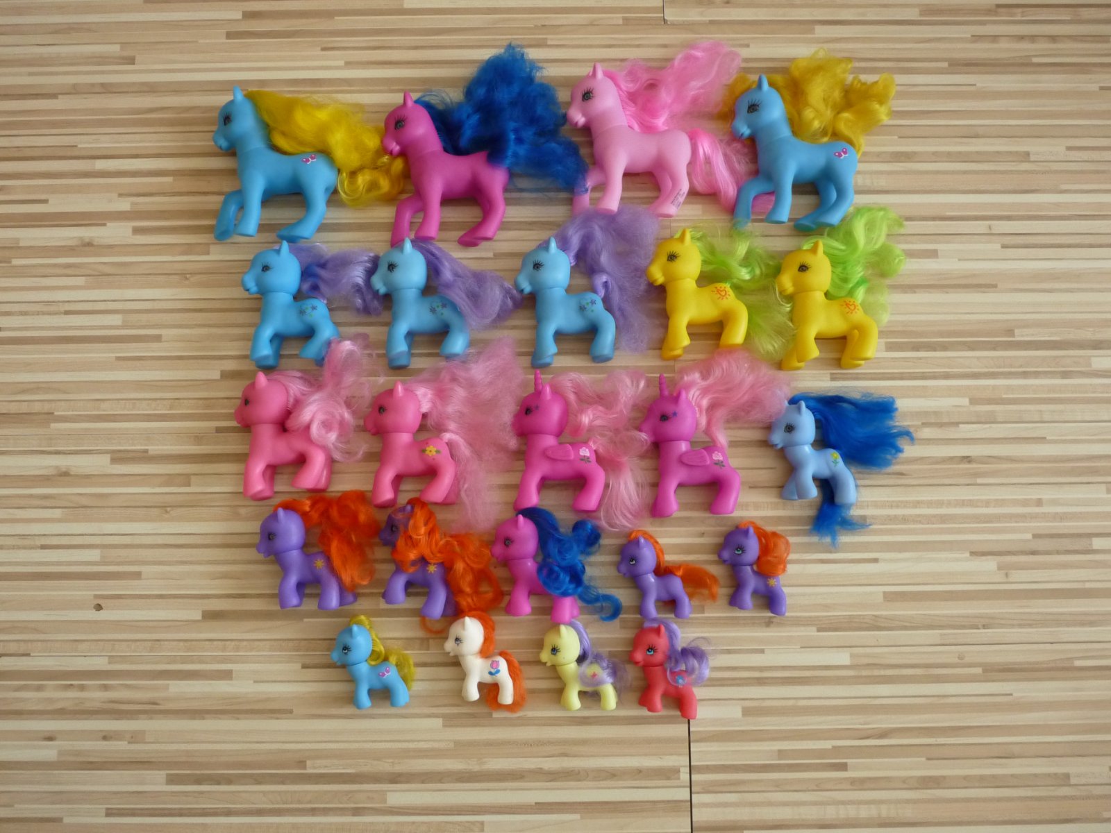 Výška kolem 7 - 14 cm. Prodávám jako celek za 230 Kč nebo po předchozí domluvě 10 Kč/ks. Případně pokud byste chtěli zkombinovat poníky z jiných vystavených inzerátů, není problém. Pokud byste potřebovali detailnější fotky některých z poníků, neváhejte se zeptat.