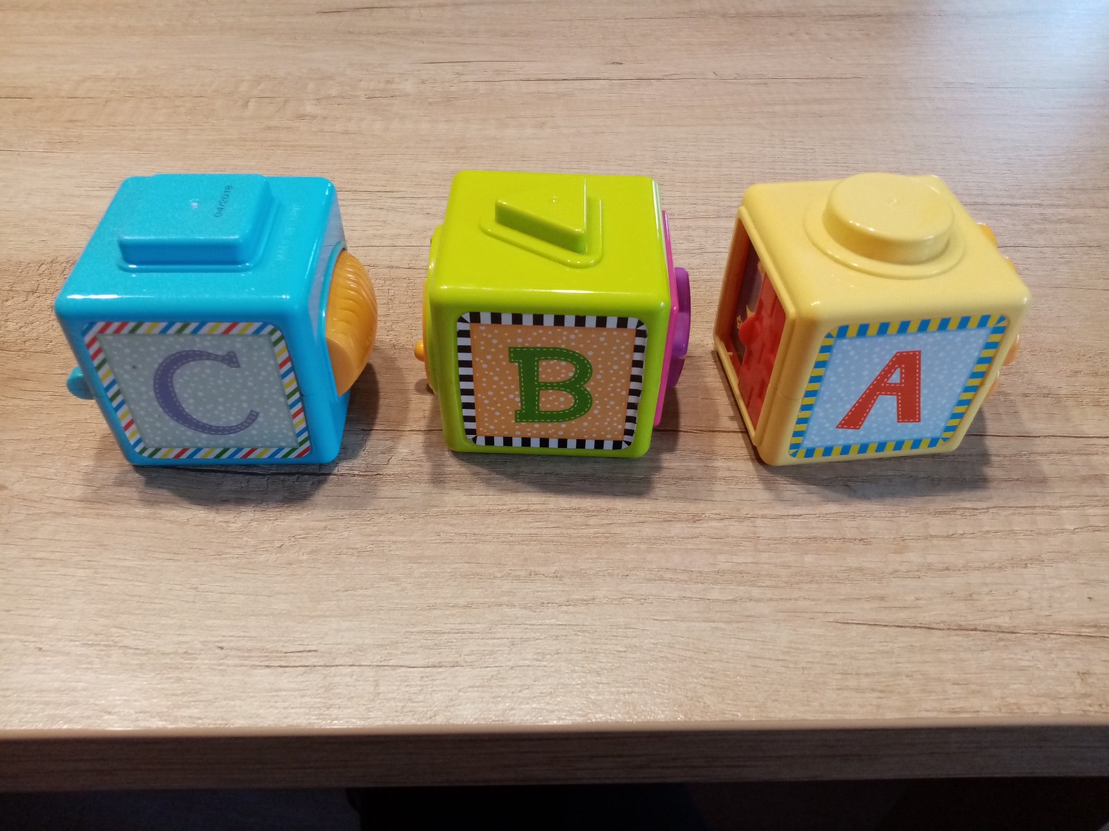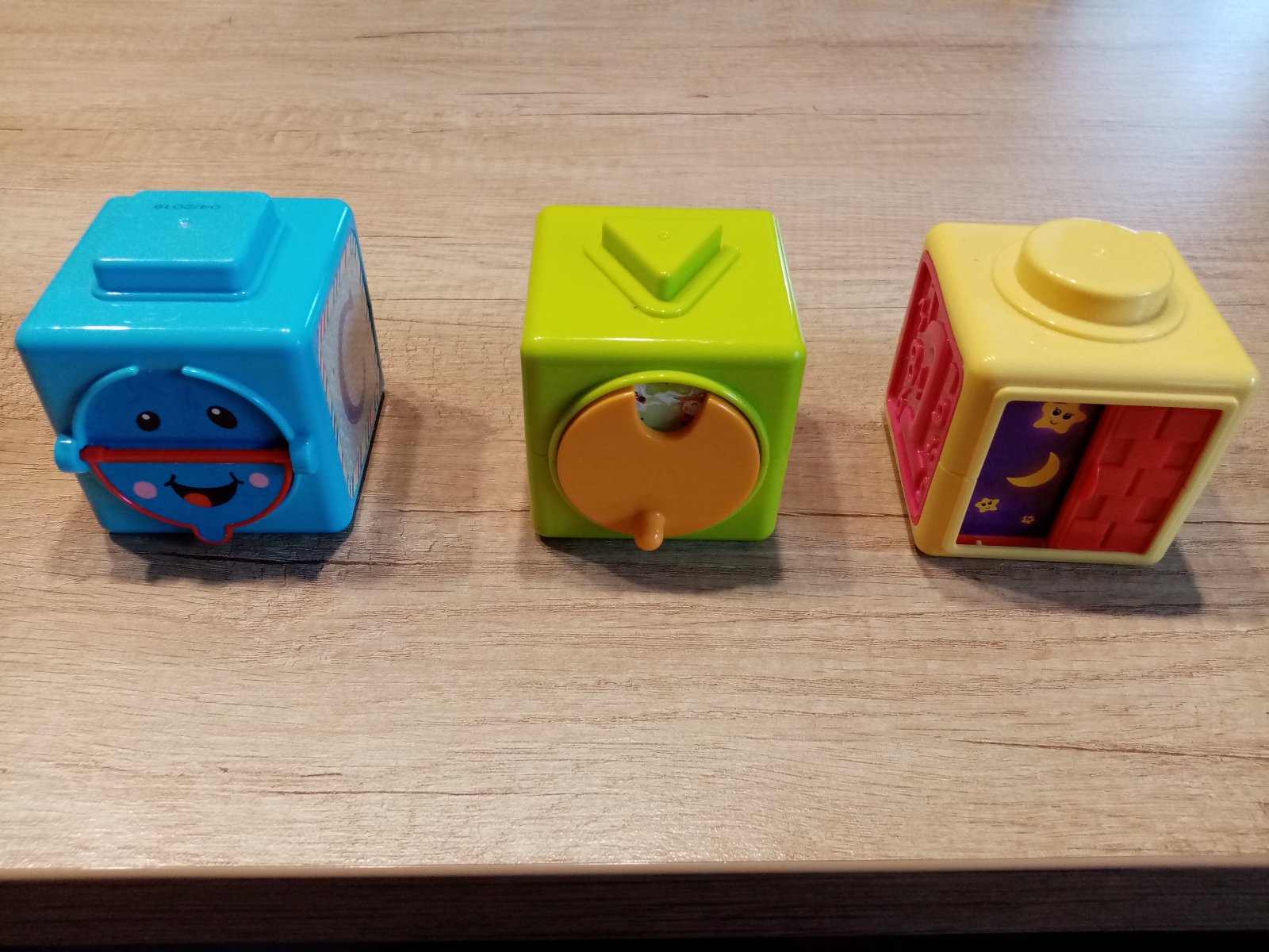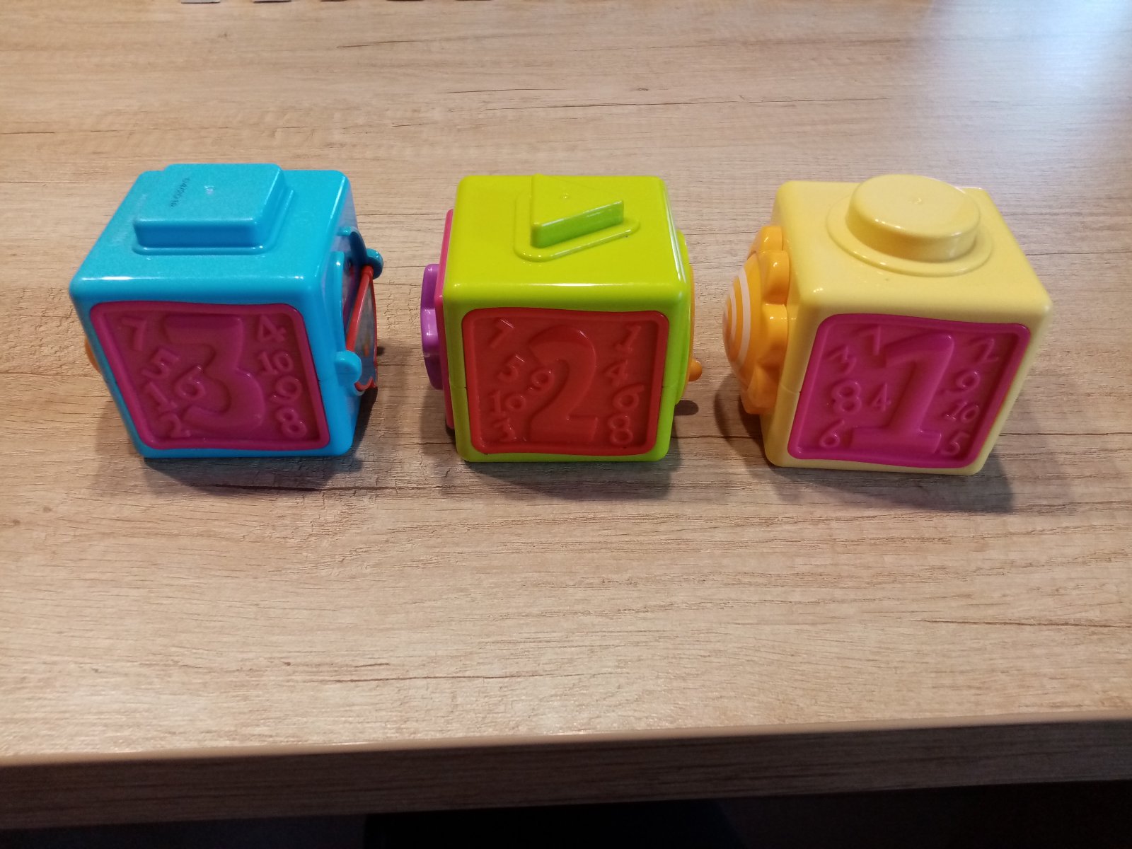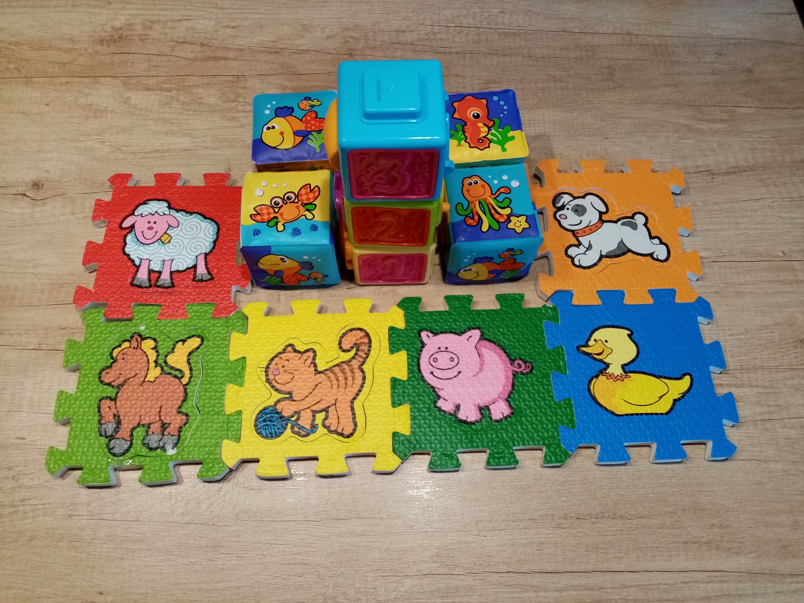 pěnové puzzle zvířátka - místy pár vad (nic hrozného), 4 x kostka se zvířátky - v pořádku, kostky na motoriku - hrané