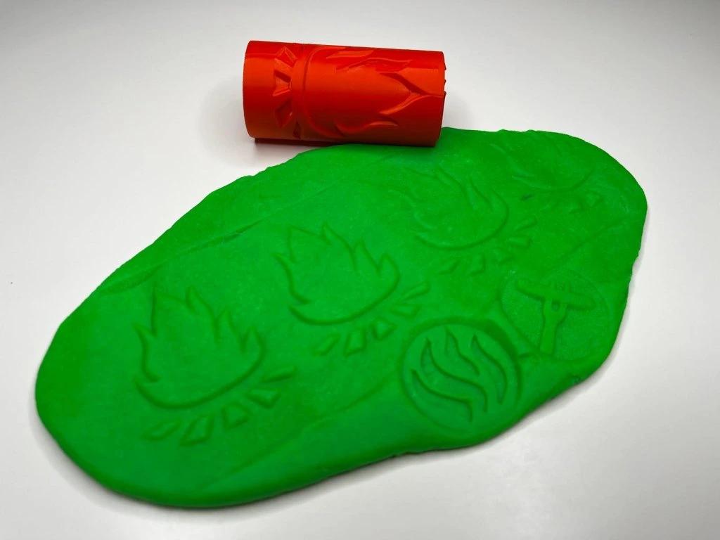 Otiskávací váleček je vhodný jako doplněk k plastelíně, kinetickému písku a k podobným hmotám.
