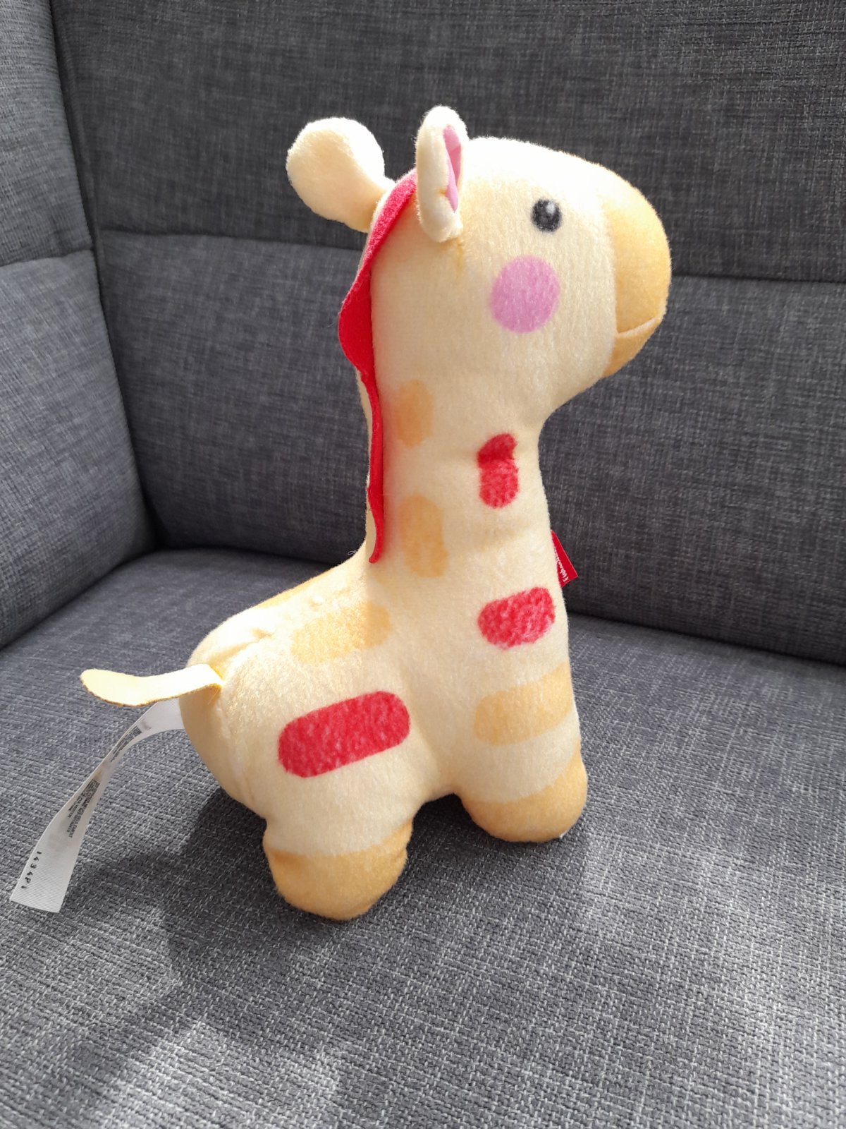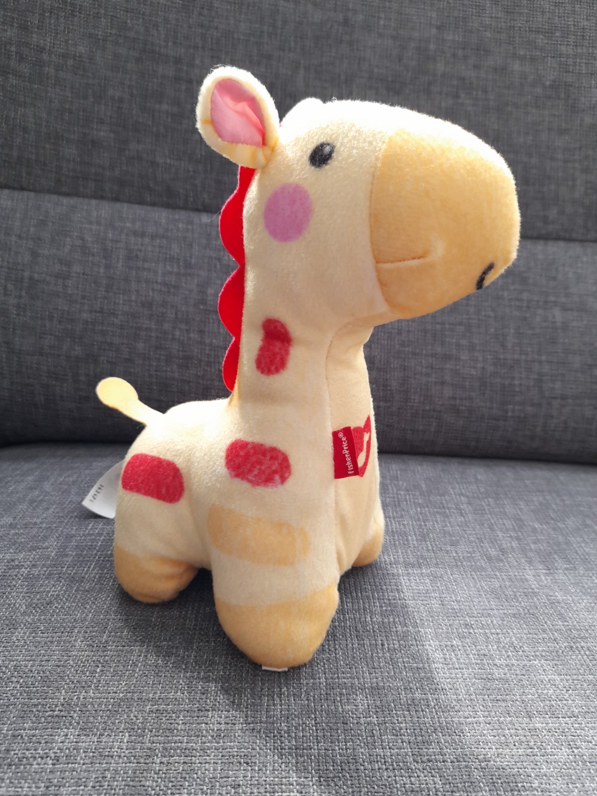 Nabízím moc hezkou hrací žirafu do postýlky pro nejmenší miminka od značky Fisherprice. Hraje tichou melodii stlačením srdíčka na hrudi žirafy. Potřebné baterie: 2x AA.