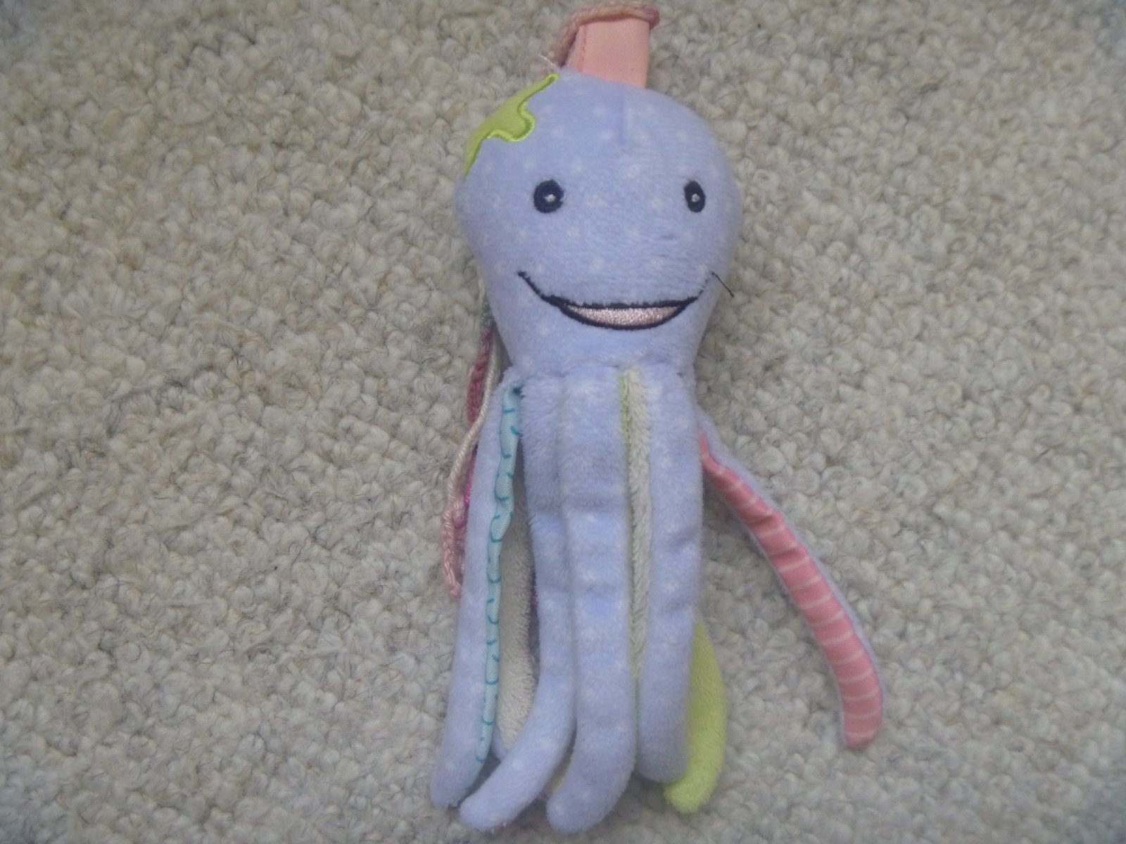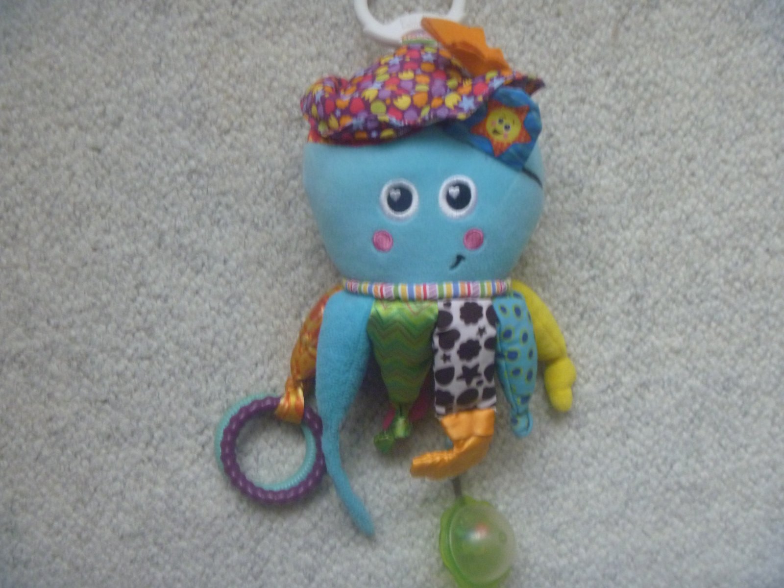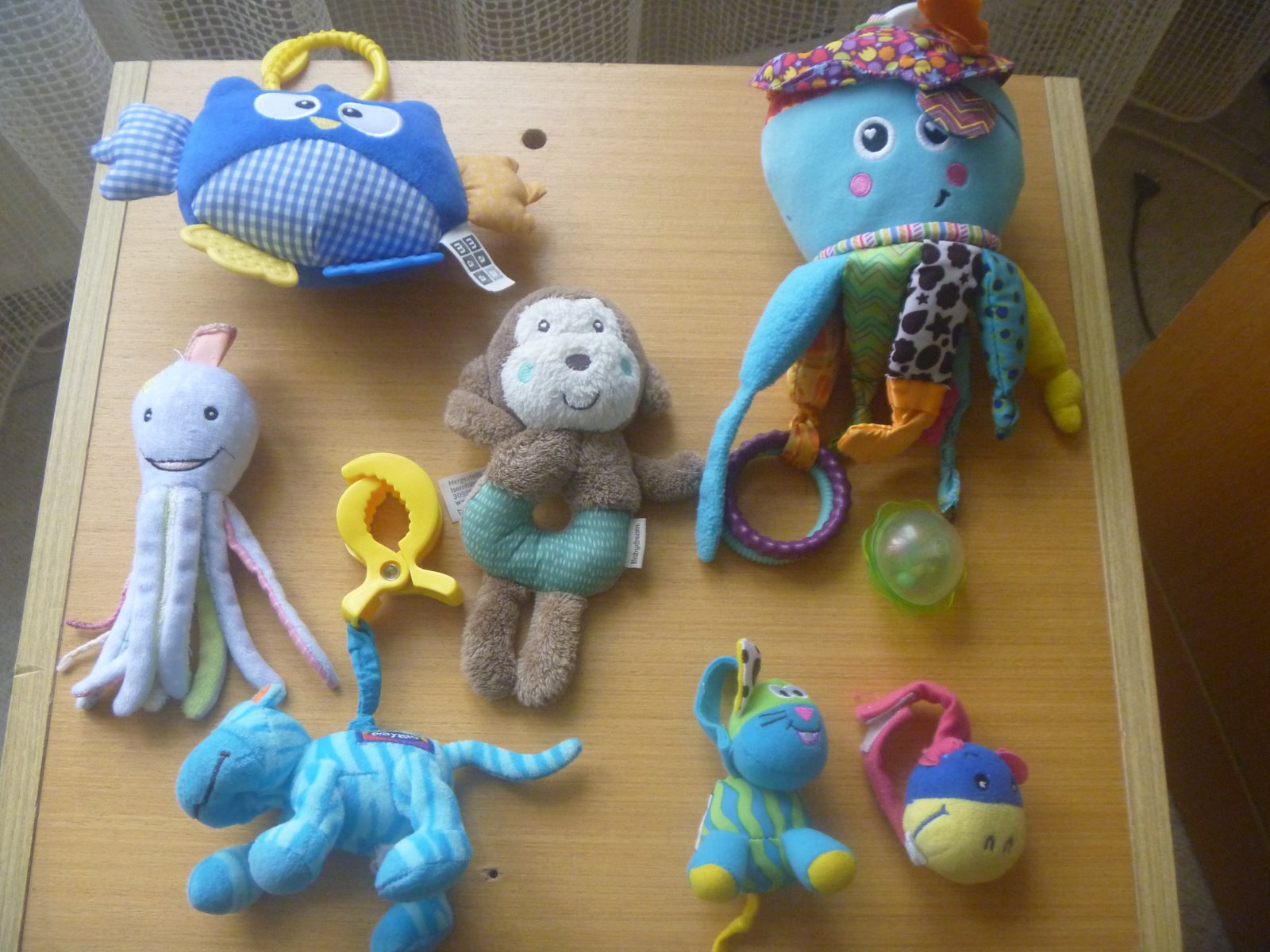2/ modrá chobotnice na zavěšení na kočárek nebo postýlku, s barevnými chapadly, některá šustí, některá zakončená kroužky a kuličkou, cena 35,- Kč