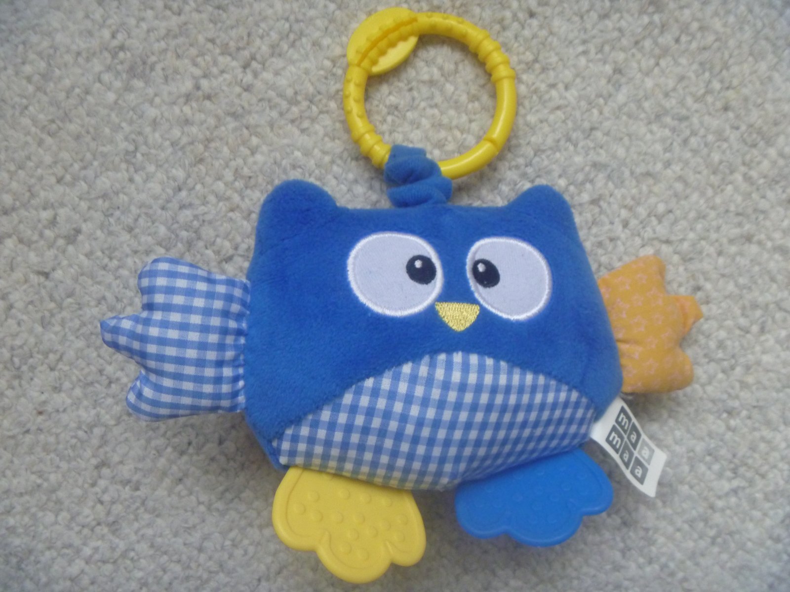 1/ modrá sova na zavěšení na kočárek nebo postýlku, lze natáhnout, materiál plyš, látka, část tělíčka šustí a nožičky měkký plast, cena 10,- Kč