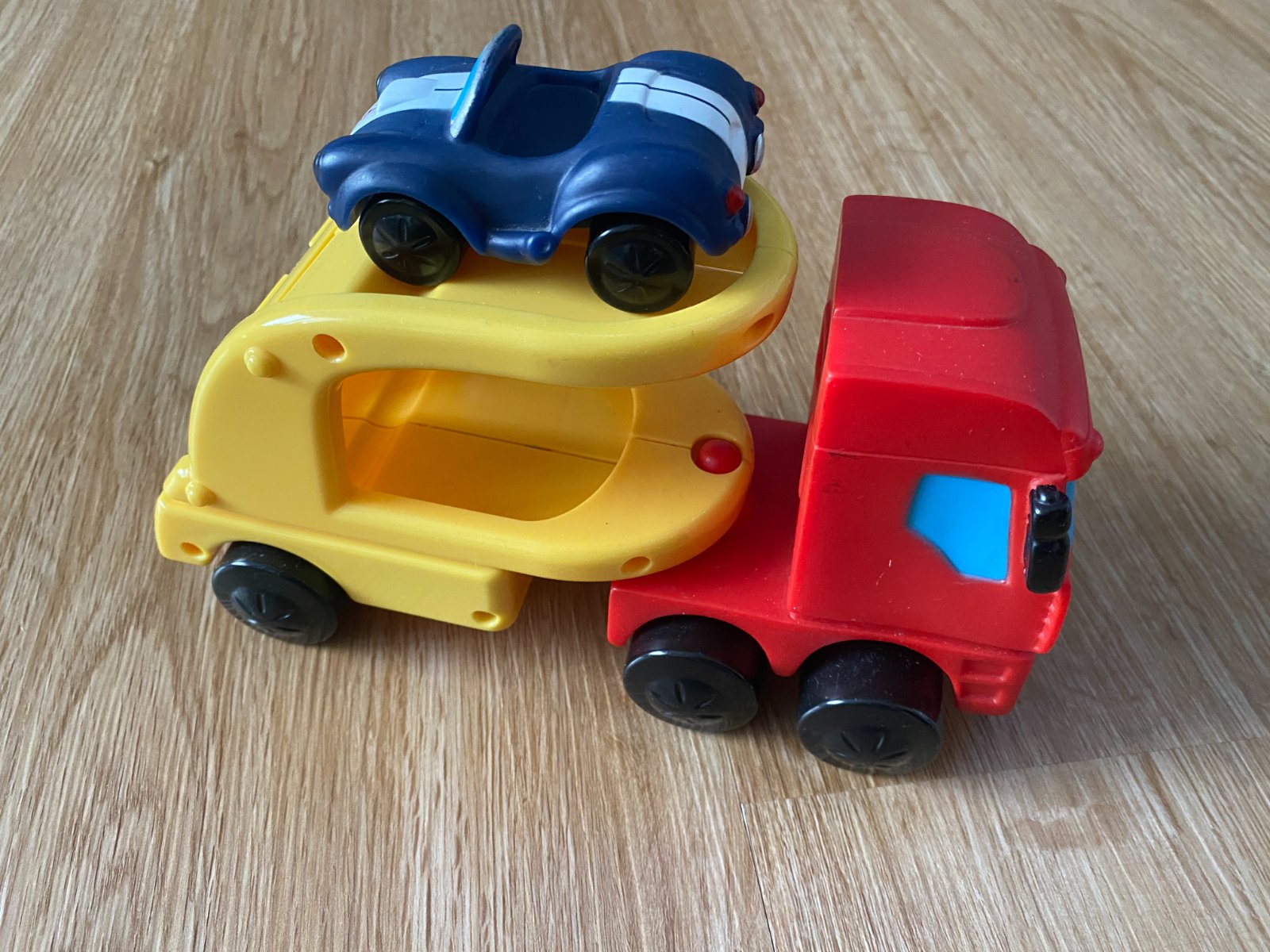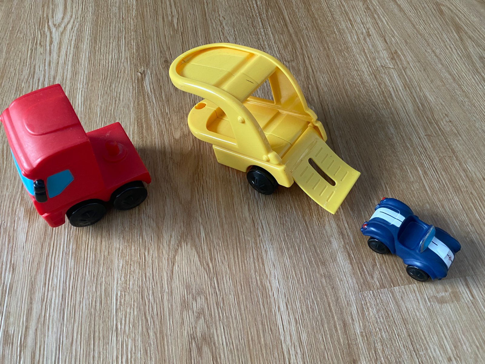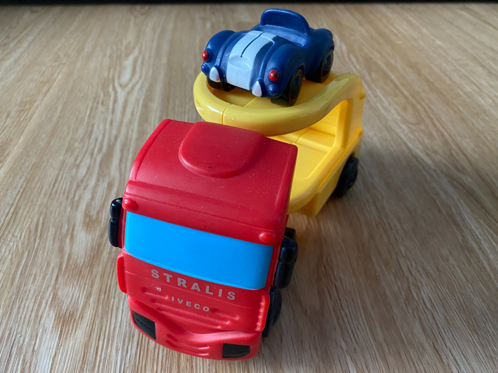 Prodám hraná autíčka – autojeřáb Oball + tahač IVECO s autem.