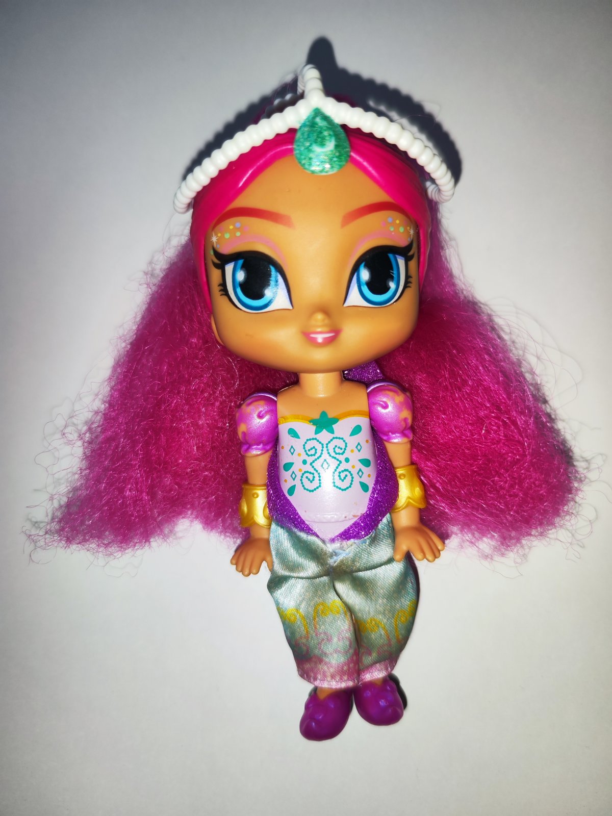 Prodám panenku Shimmer, jednu z hlavních postav z animovaného seriálu Shimmer a Shine. Barevná panenka s růžovými vlasy a orientálním outfitem – ideální pro malé fanoušky kouzelného světa džinů. Má bílou čelenku s tyrkysovým kamenem, 2 zlaté náramky, boty jsou sundavací. K tomu přidám růžový hřebínek. Vysoká je cca 16, 5 cm. Cena 100 Kč, v Brně možné osobní předání.
