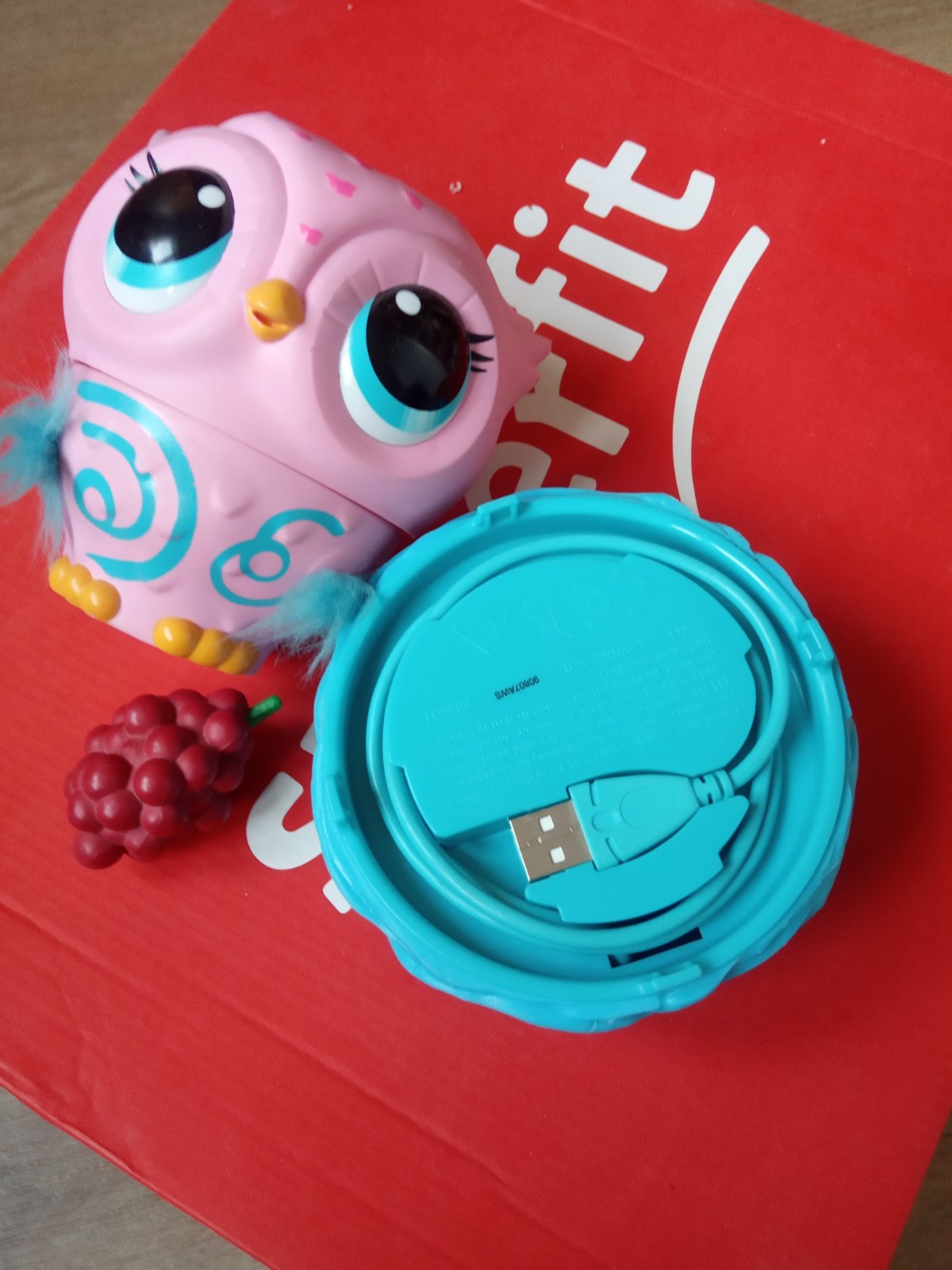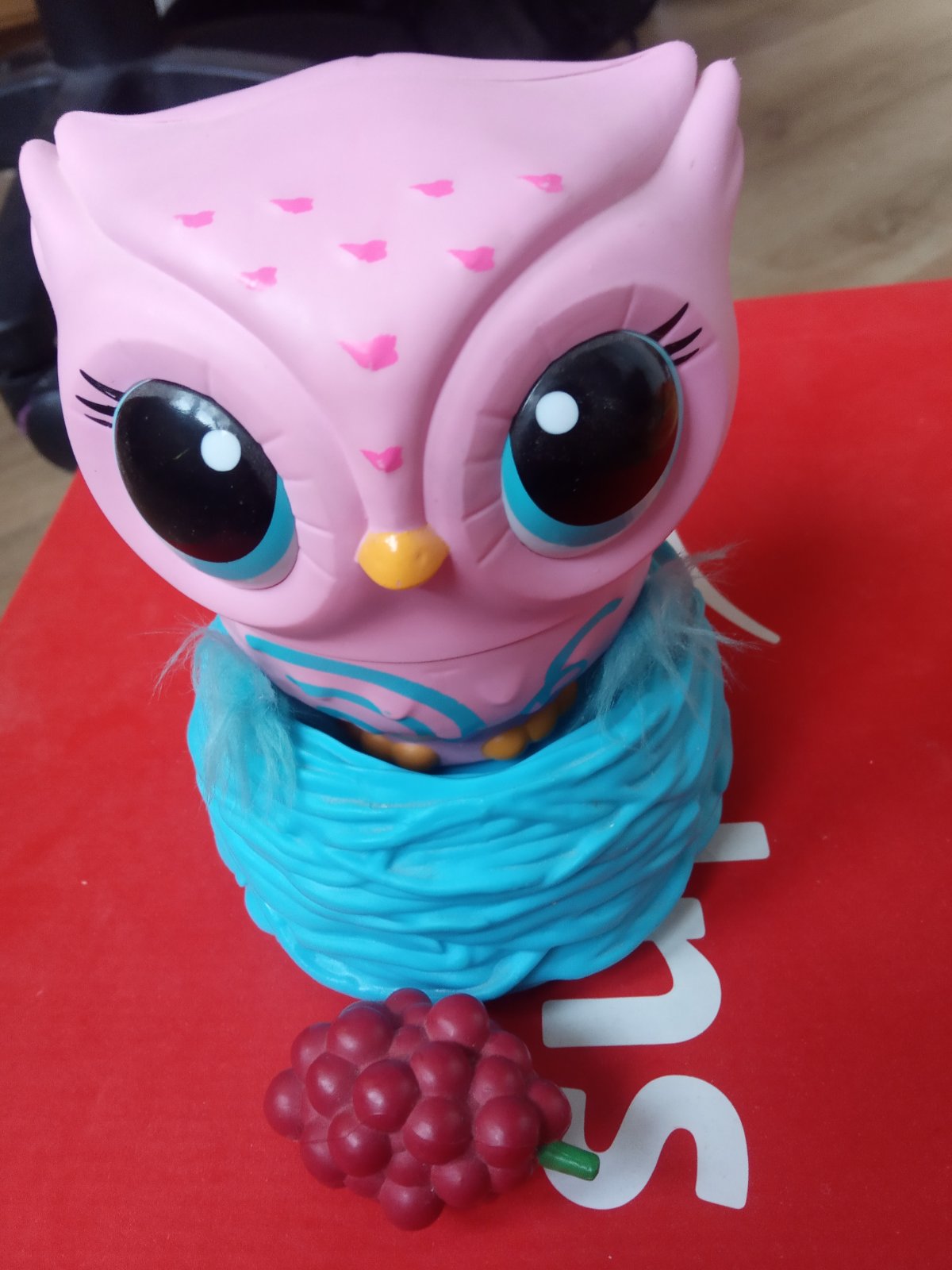 Nauč sovu létat,sova je náladová, má hlad,je smutná, pláče,je ji zima, má radost,je lochtivá, zpívá.Musíš ji naučit létat, čím déle ji to učíš tím dál doletí,chce létat jen když se o ni dobře staráš a má dobrou náladu, můžeš ji krmit malinou,po jídle si říhne, někdy má škytavku, svítí ji barevně oči podle nálady.Nabíjení přes kabel.Malo používána,dcera si sní párkrát hrála,uz je na ni velká nevyužijeme,moc hezká,po několika pokusech o létání létala až ke stropu, zajímavá hračka pro malé slečny.
