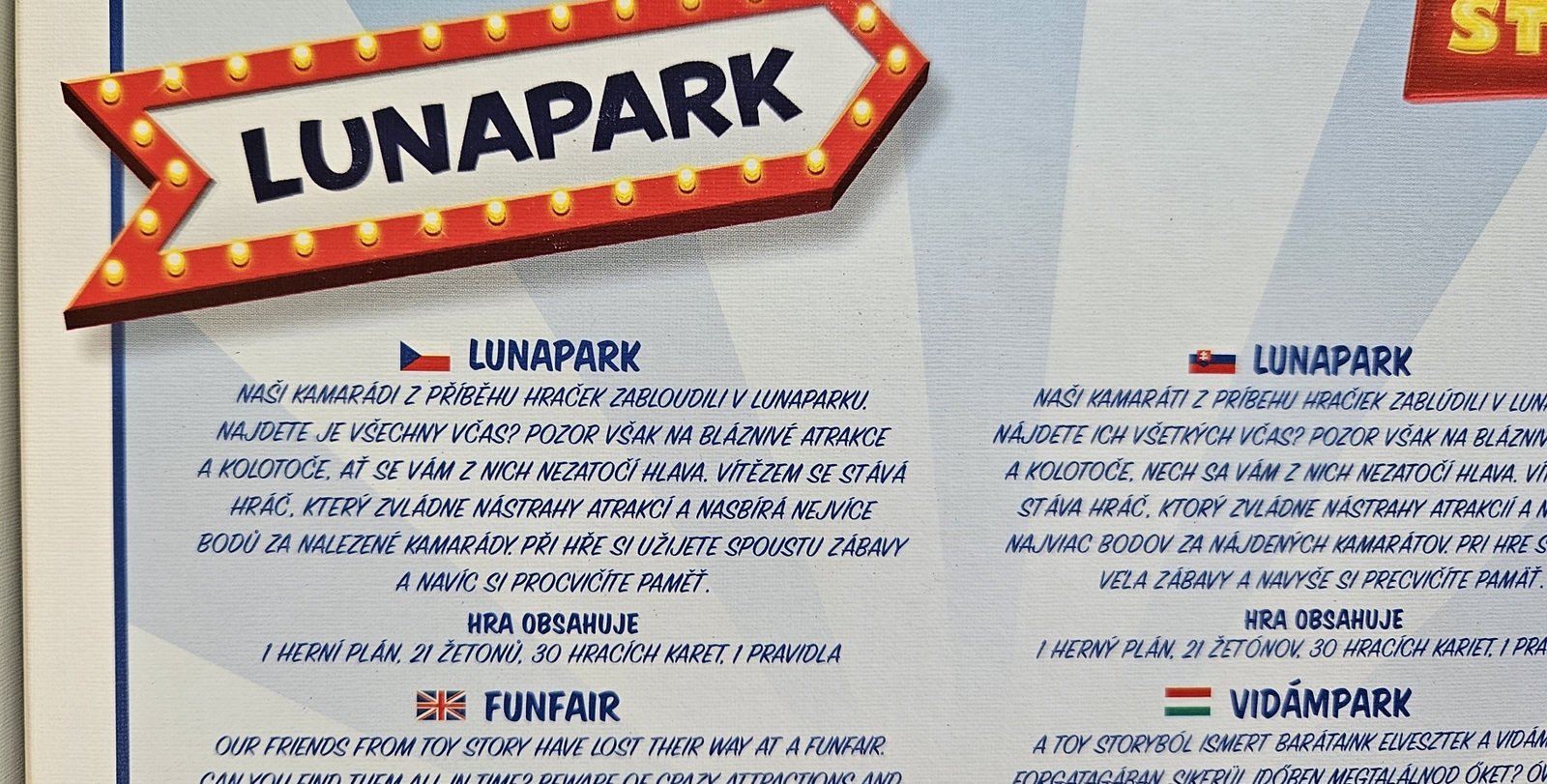 Popis výrobce: Staňte se součástí filmového Příběhu hraček. Oblíbení hrdinové z Toy Story zabloudili v lunaparku a spoléhají na vás, že je najdete! Stihnete to včas, nebo se chytíte do nástrah bláznivých kolotočů a atrakcí, které umí zamotat hlavu na počkání? Vyhraje ten, kdo úspěšně zdolá všechny překážky a nasbírá nejvíc bodů za nalezené hrdiny.