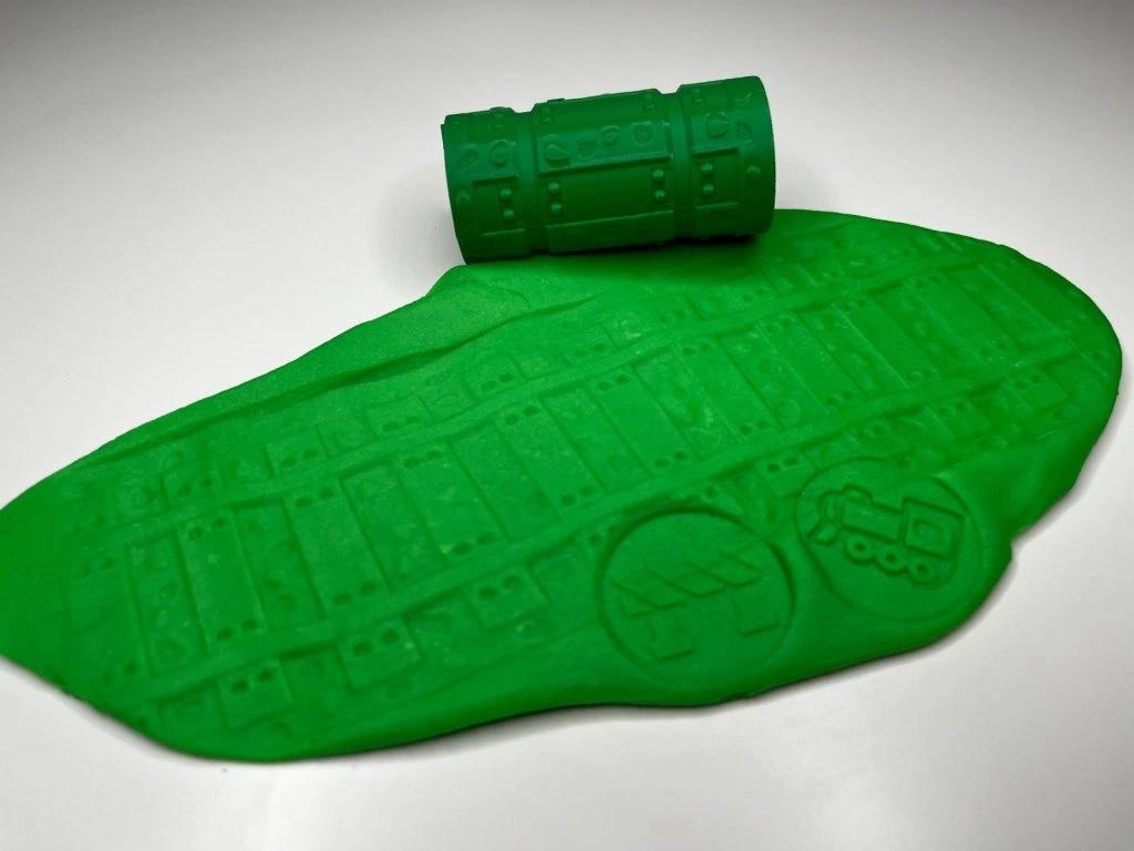 Otiskávací váleček je vhodný jako doplněk k plastelíně, kinetickému písku a k podobným hmotám.