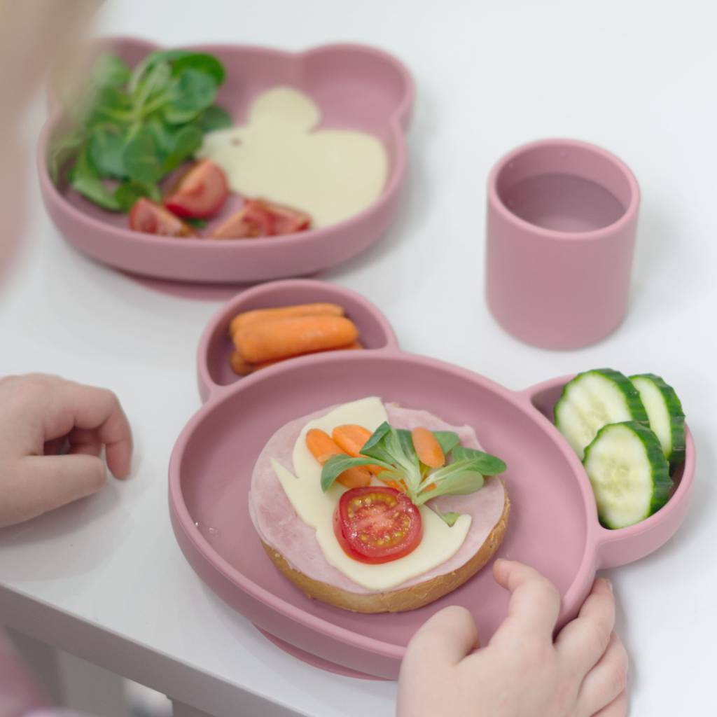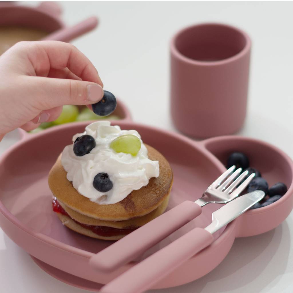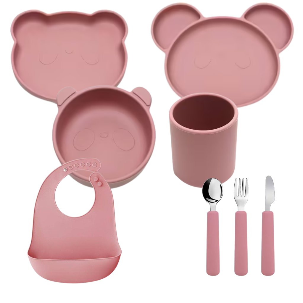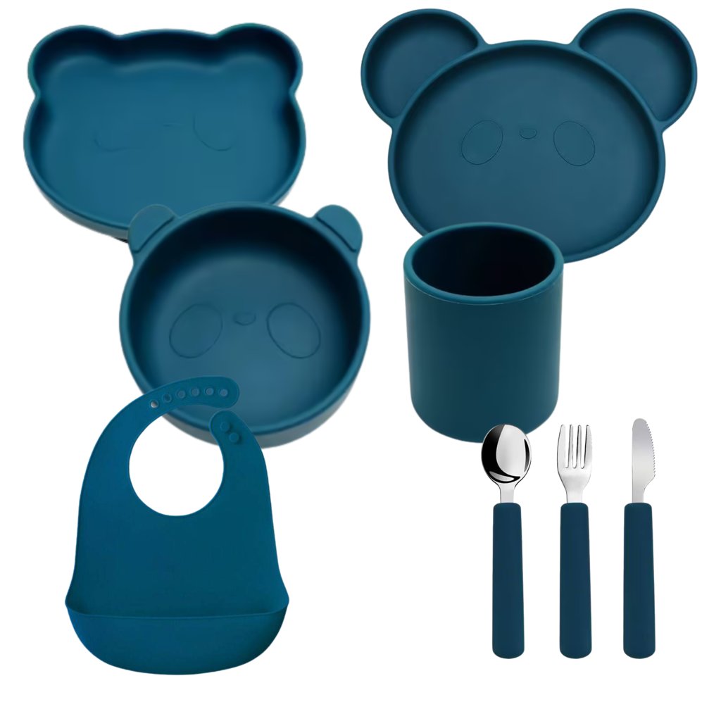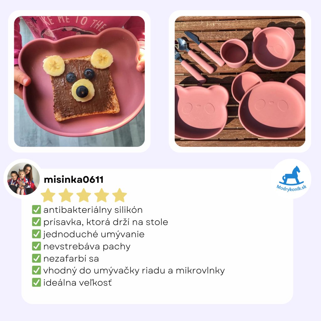 Vícedílný jídelní set s roztomilým zvířecím motivem je vyroben z potravinářského silikonu, který je antibakteriální, snadno omyvatelný a vyznačuje se i tím, že na něm po umytí nezůstávají barevné skvrny od jídla. Příbor v dětské rukojeti neklouže a děťátko si může procvičovat svůj úchop. Skvělou vychytávkou je zajištění stability talířků a misky díky přilnavé spodní části. Set je vhodný od začátku zavádění příkrmů až po období samostatného jídla.