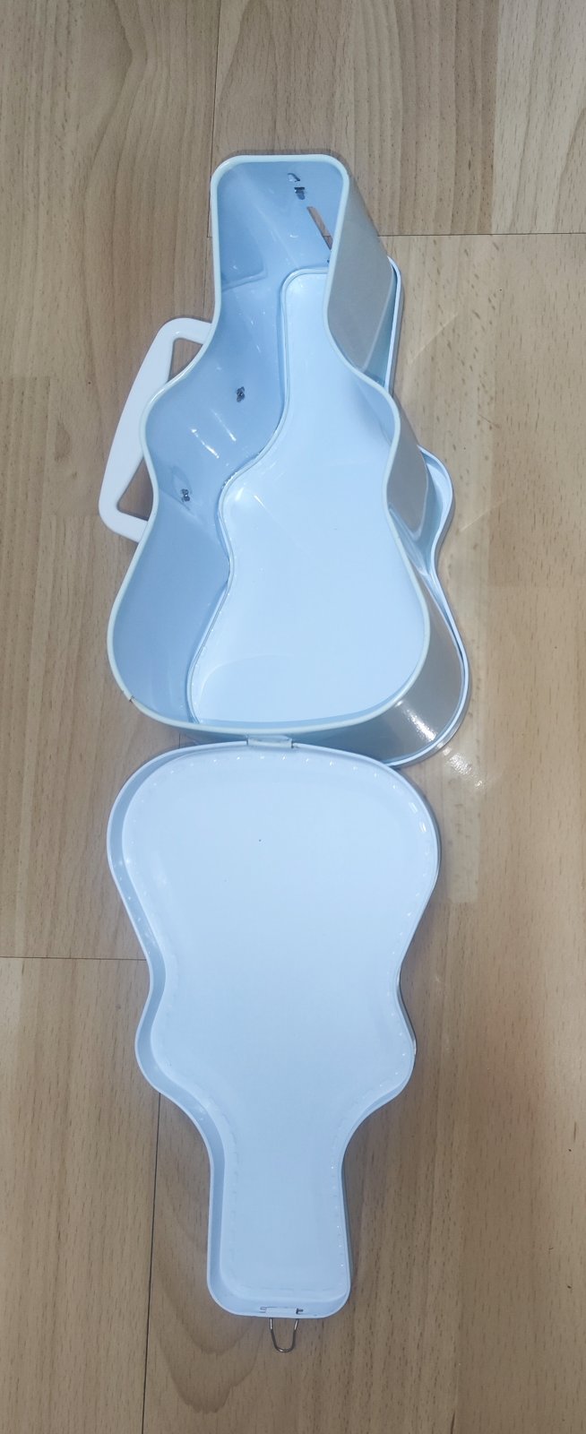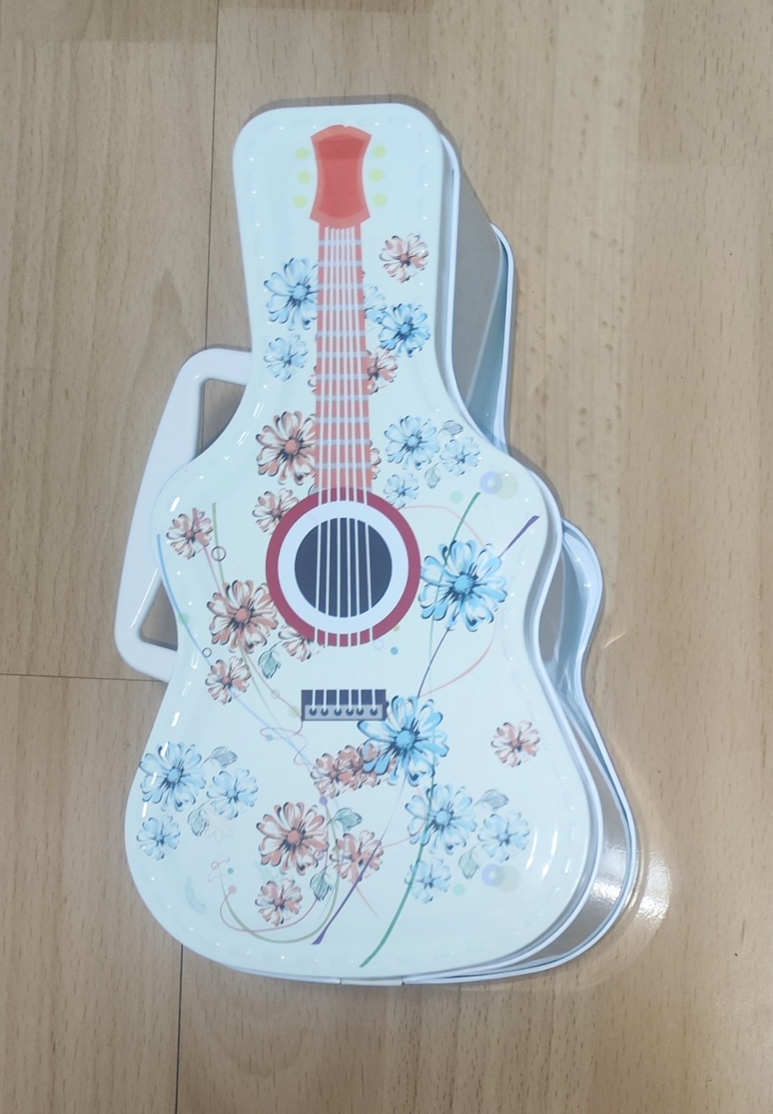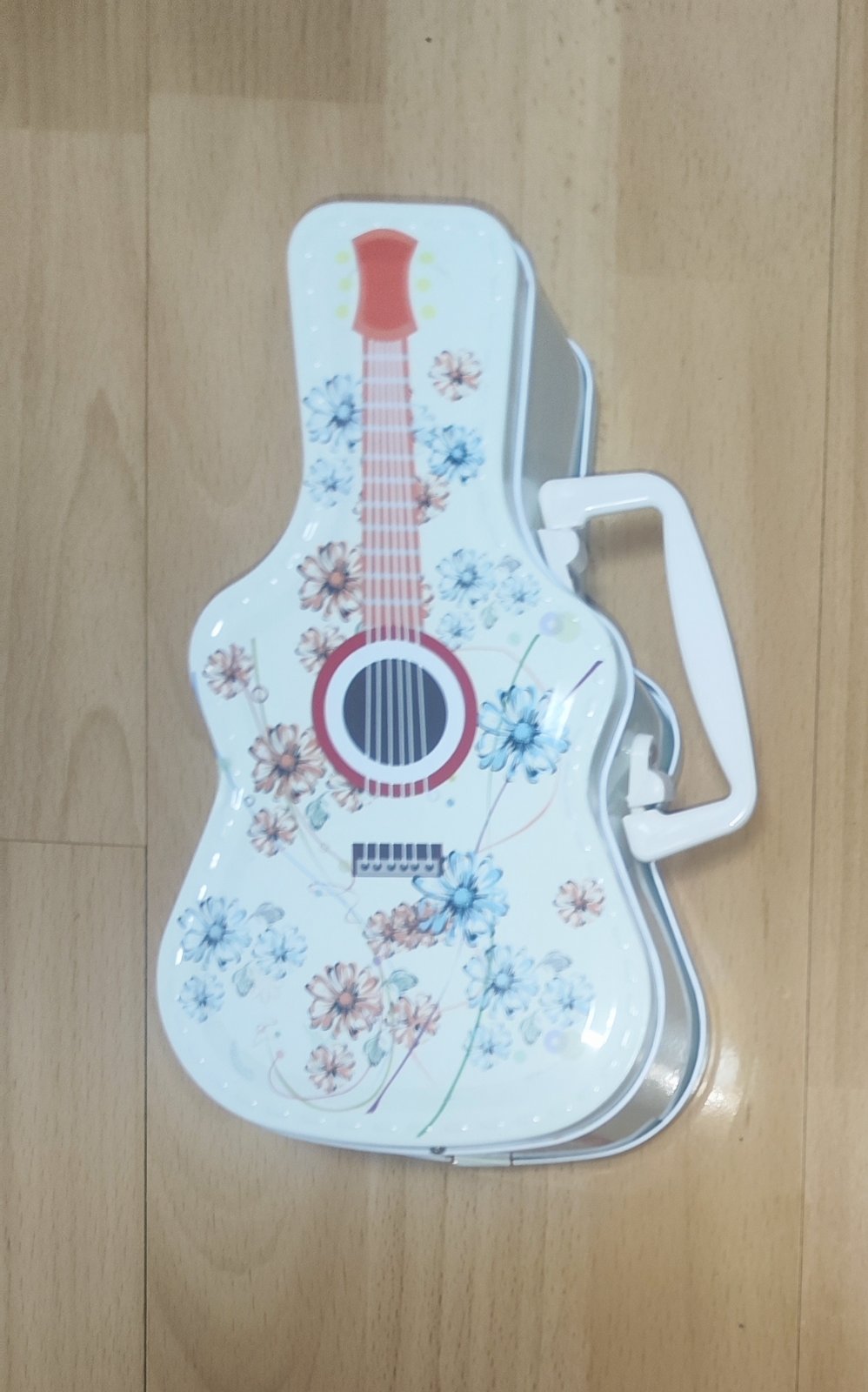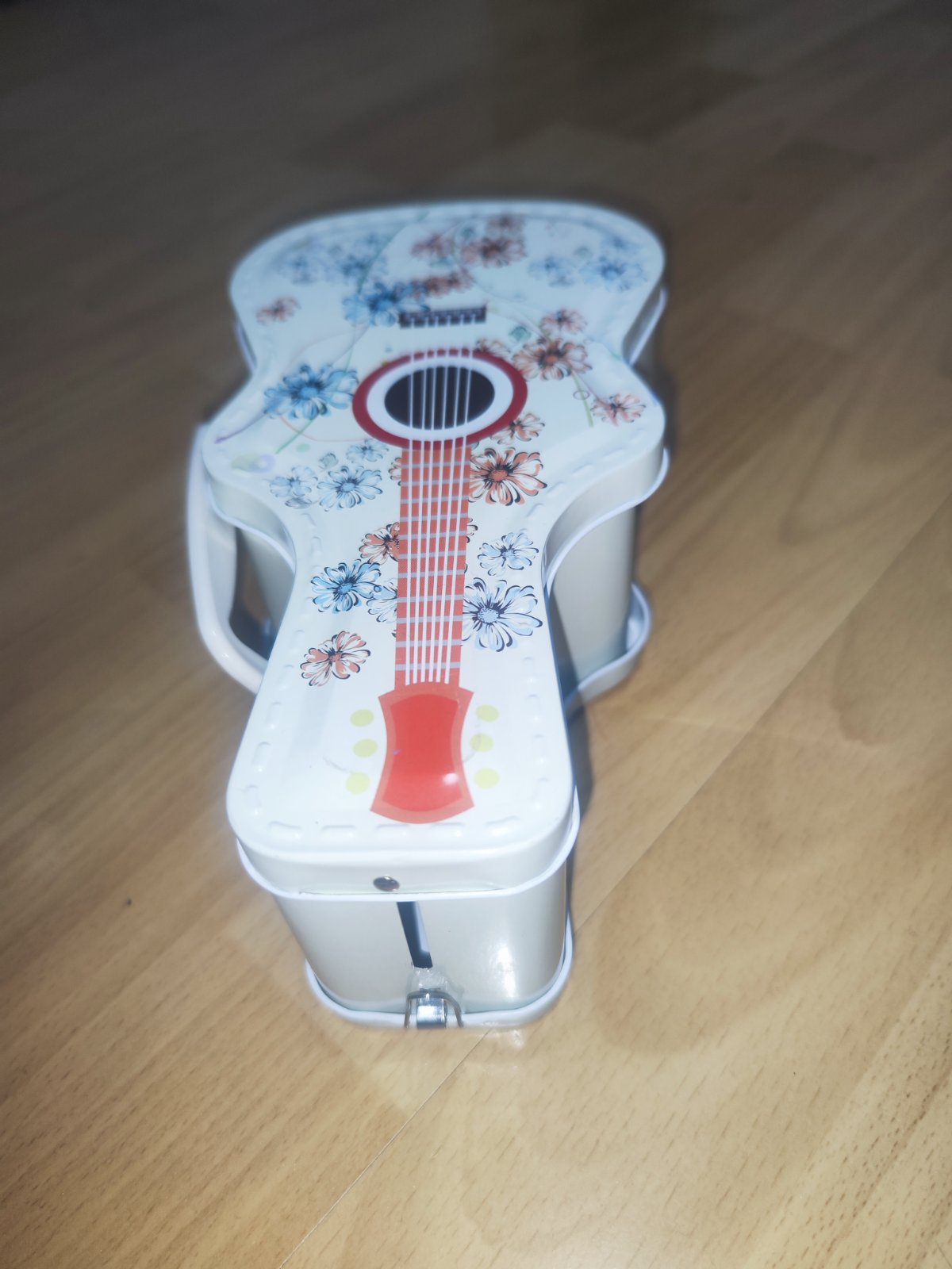 Prodám originální plechovou krabičku ve tvaru kytary – s květinovým potiskem, praktickou boční úchytkou pro snadné přenášení. Rozměry – délka 22, 5 cm, maximální šířka 12 cm; výška 7, 5 cm. Vhodná na drobnosti – pastelky nebo fixy, malé plyšáčky, figurky, tajná schránka na poklady (krabička má kovové očko, na které lze nasadit malý visací zámeček – není součástí) či pro hudební nadšence – na trsátka, struny nebo drobné doplňky i jako dárkové balení – originální obal na voucher na koncert nebo hudební kurz, může to být i pokladnička (je tam otvor na mince). Hodí se i jako dekorace. Cena 80 Kč, v Brně možné osobní předání.