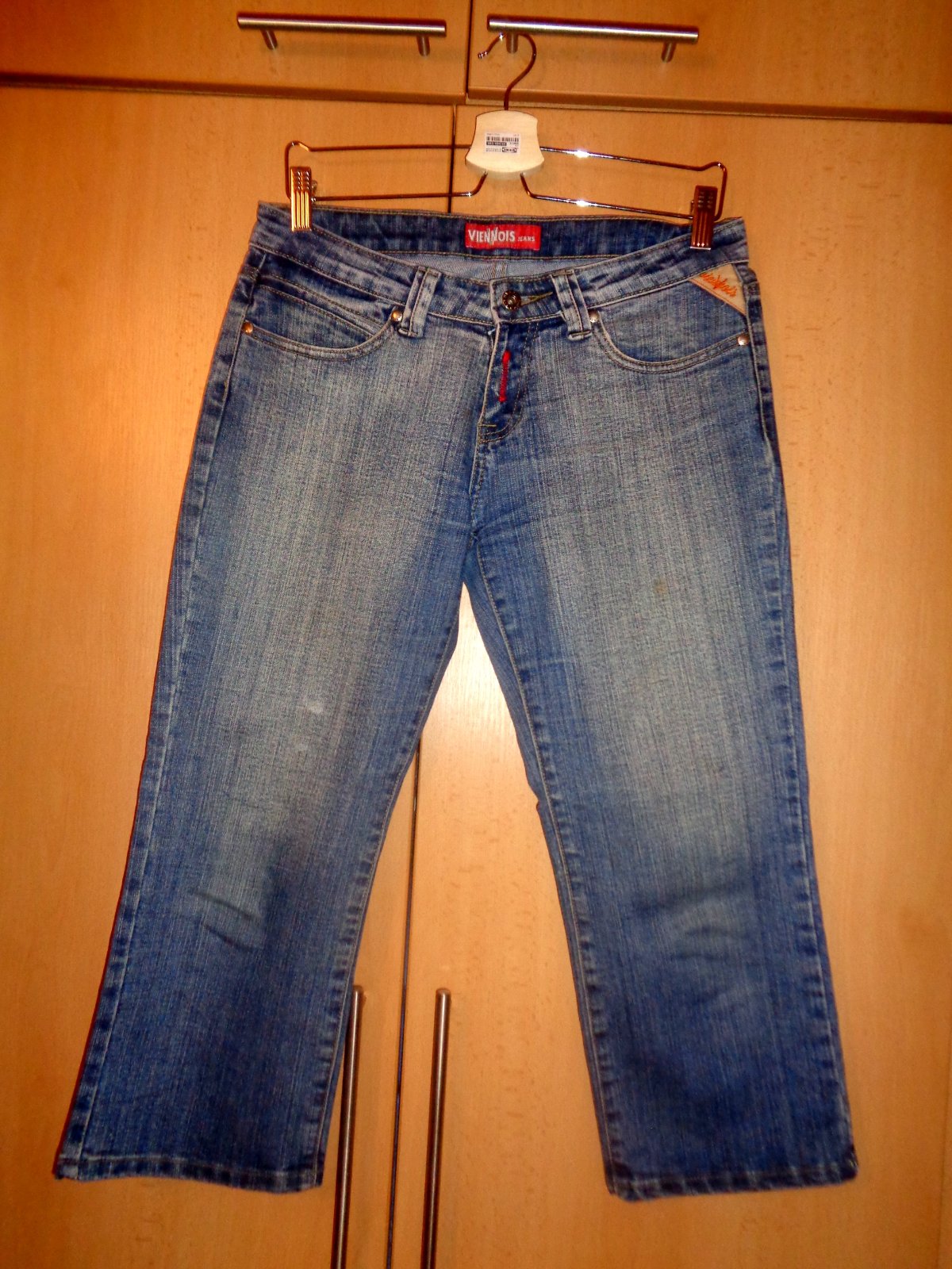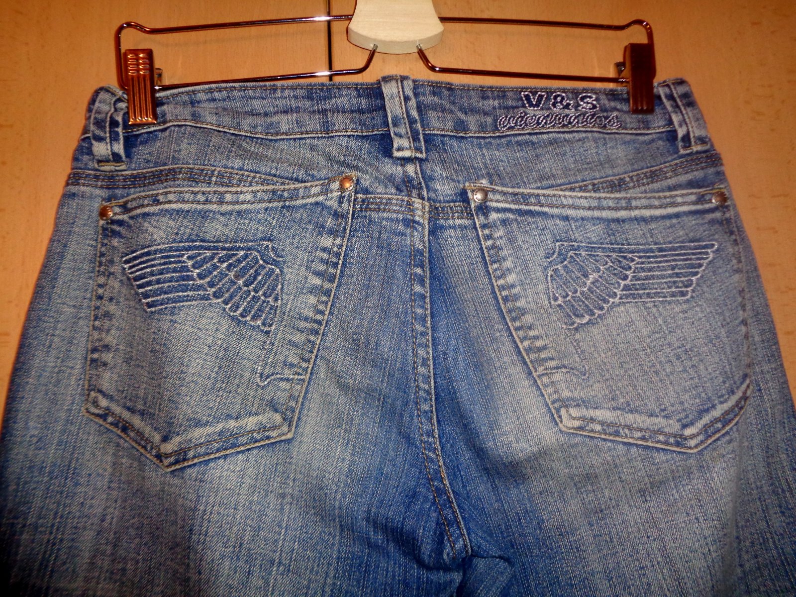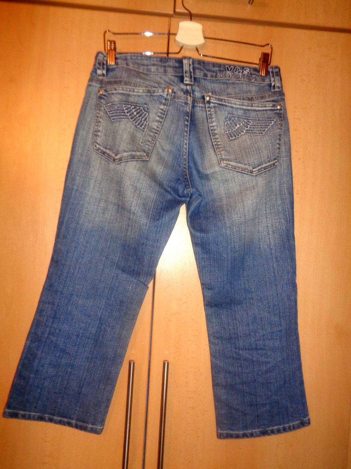 100% BAVLNA. VELMI PŘÍJEMNÁ MĚKOUČKÁ RIFLOVINA. NOŠENÉ - PARÁDU NADĚLAJÍ. VPŘEDU NEPATRNÝ FLÍČEK - NEZKOUŠELA JSEM ODSTRANIT. VZADU NA KAPSÁCH VYŠITÁ KRÁSNÁ ANDĚLSKÁ KŘÍDLA.