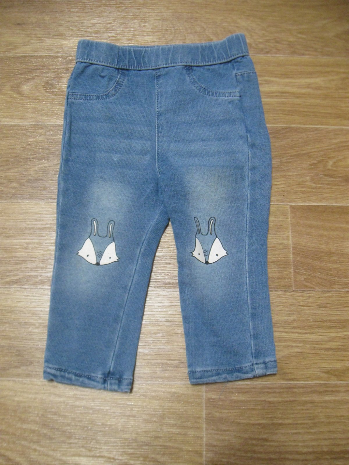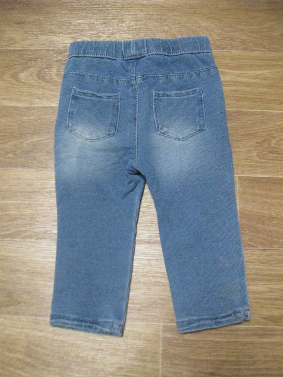 Pružné džíny v dobrém stavu. V pase regulační guma a knoflíky. Vnější délka nohavice 41 cm, vnitřní délka nohavice 24,5 cm, šířka v pase 24 cm.