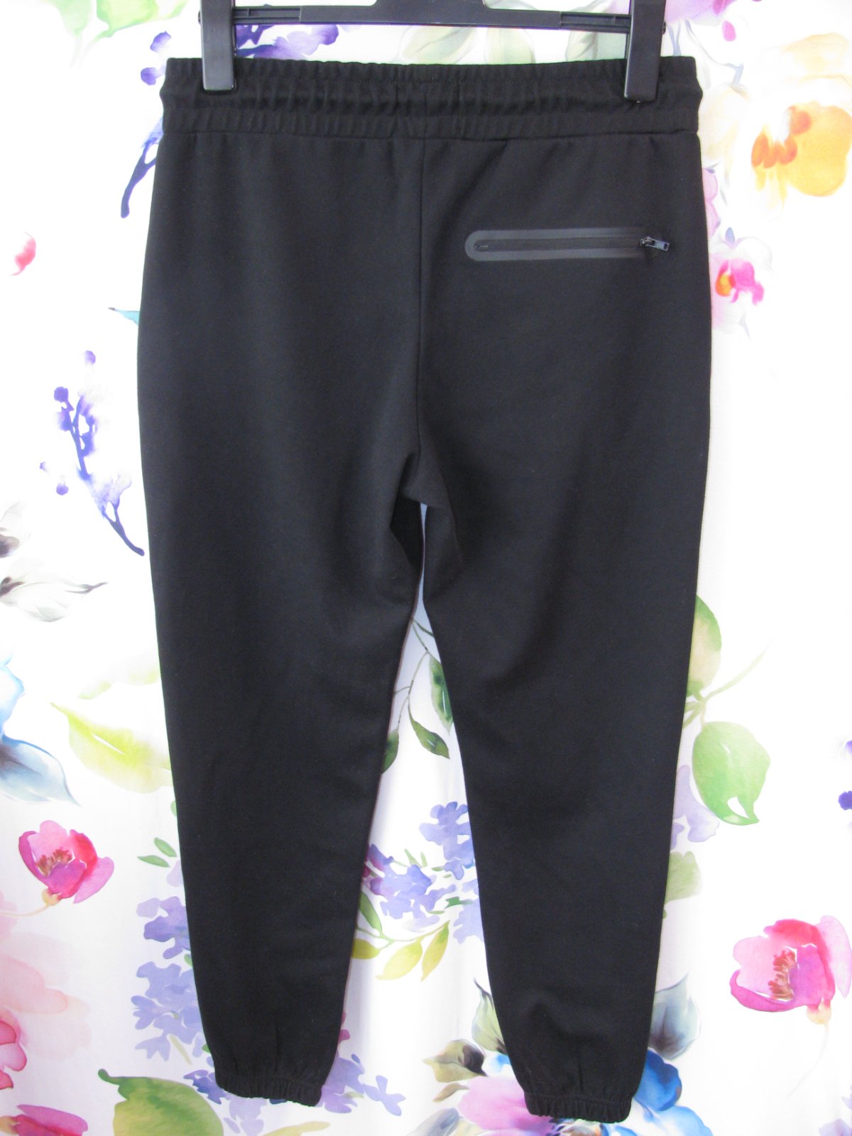 Krásné černé teplákové kalhoty, boční kapsy na zip, v pase guma a šňůrka, konce nohavic do gumy, 62% polyester, 36% bavlna, 2% elastan. Top stav bez vady, velmi málo nošené. Unisex.