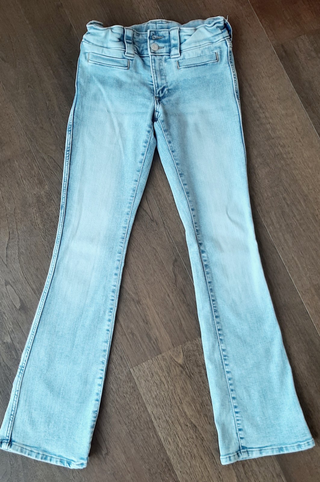 Prodám dívčí džíny H&M, světle modré barvy, střih bootcut, velikost 152. Zapínání na zip a 2 knoflíky. Vepředu 2 kapsy. Nastavitelná velikost v pasu. Džíny jsou v perfektním stavu.