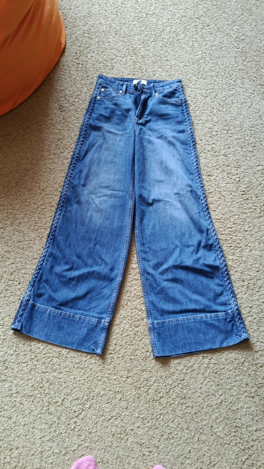 Vyřazeno z přeplněného šatníku naší Viki. Ve velmi dobrém stavu, málo vynošené, moderní vysoký pas, široký střih nohavic, vespod zúžený, funkční uzávěr i kapsy.