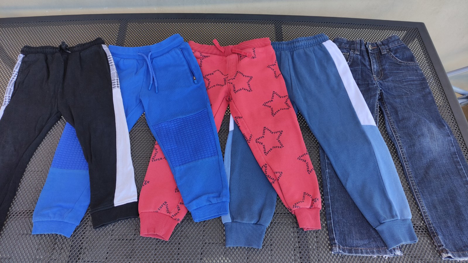 Džíny vel.110 s regulací pěkné bez vad ale konce nohavic trochu roztřepené(později jde střihnout na kraťasy)
