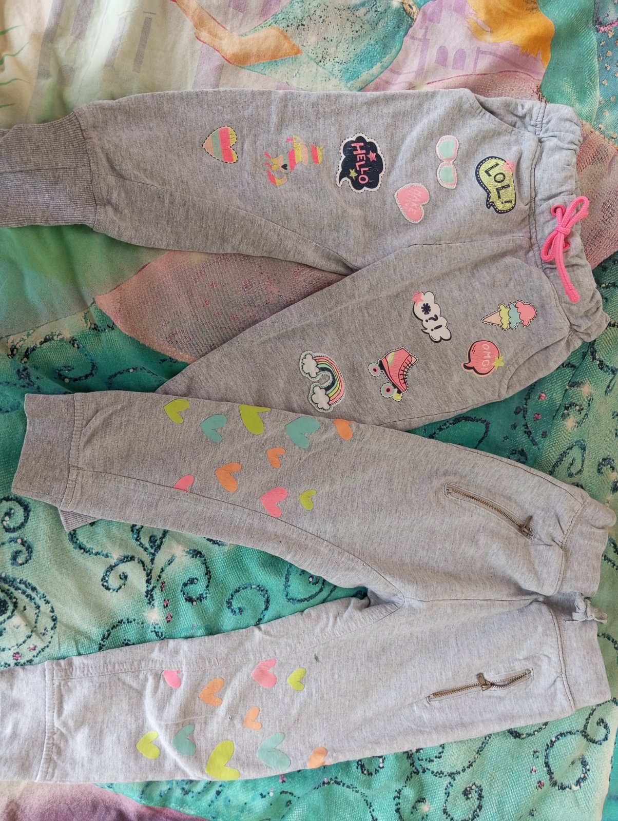 Pěkné tepláčky,v pase na gumu,na těch se srdíčky čmouha od fixy,jinak bez vad.Cena za oboje.Jeste jsem doplnila o jedny tm.modré,táž velikost,cena 30,-