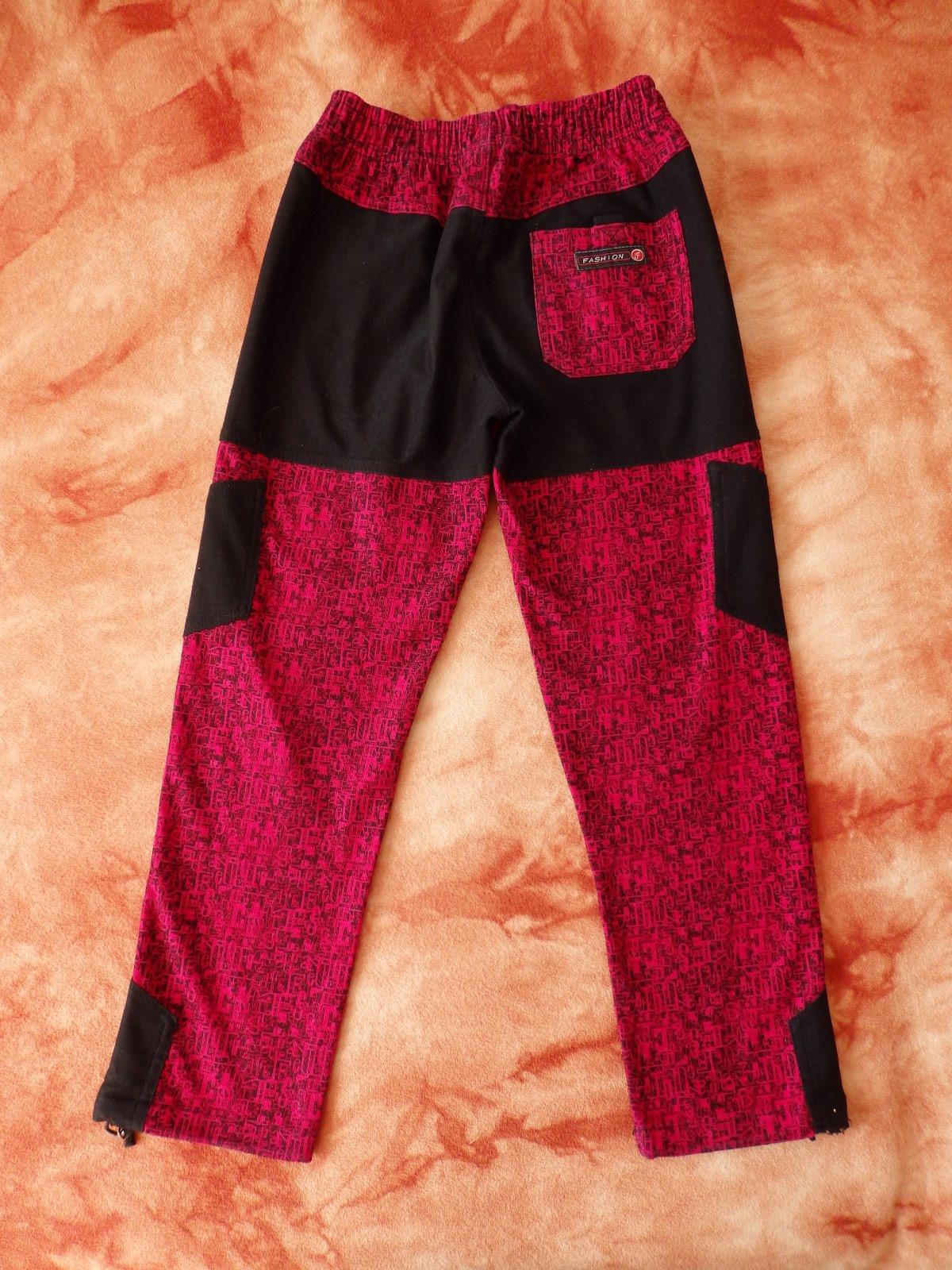 Pěkné vínové kalhoty, měkkoučké, příjemné na nošení, velikost není uvedena, ale nosili jsme jako 134/140, ve velmi pěkném stavu. Dvě přední kapsy na zip (levý zip nemá přívěšek na otevírání, jen jezdec), zadní kapsička. Gumička v nohavici už je vytahaná, není tam potřeba.