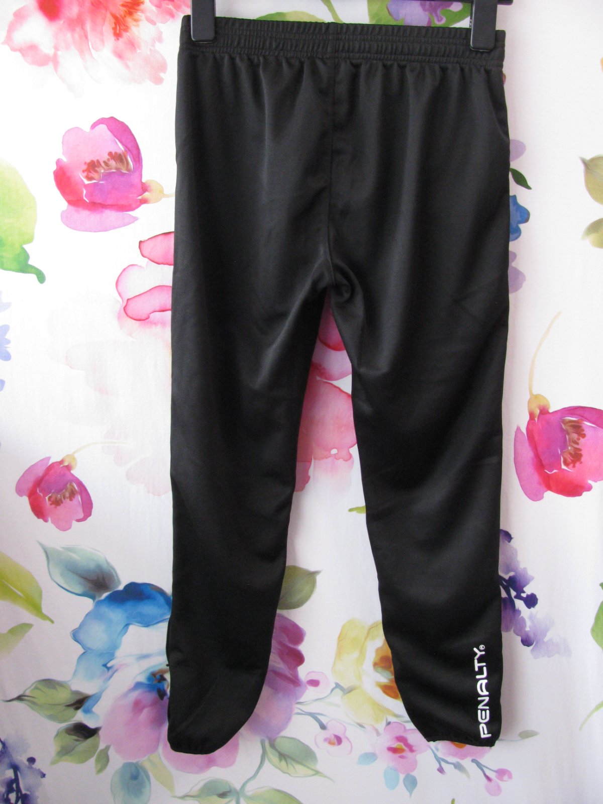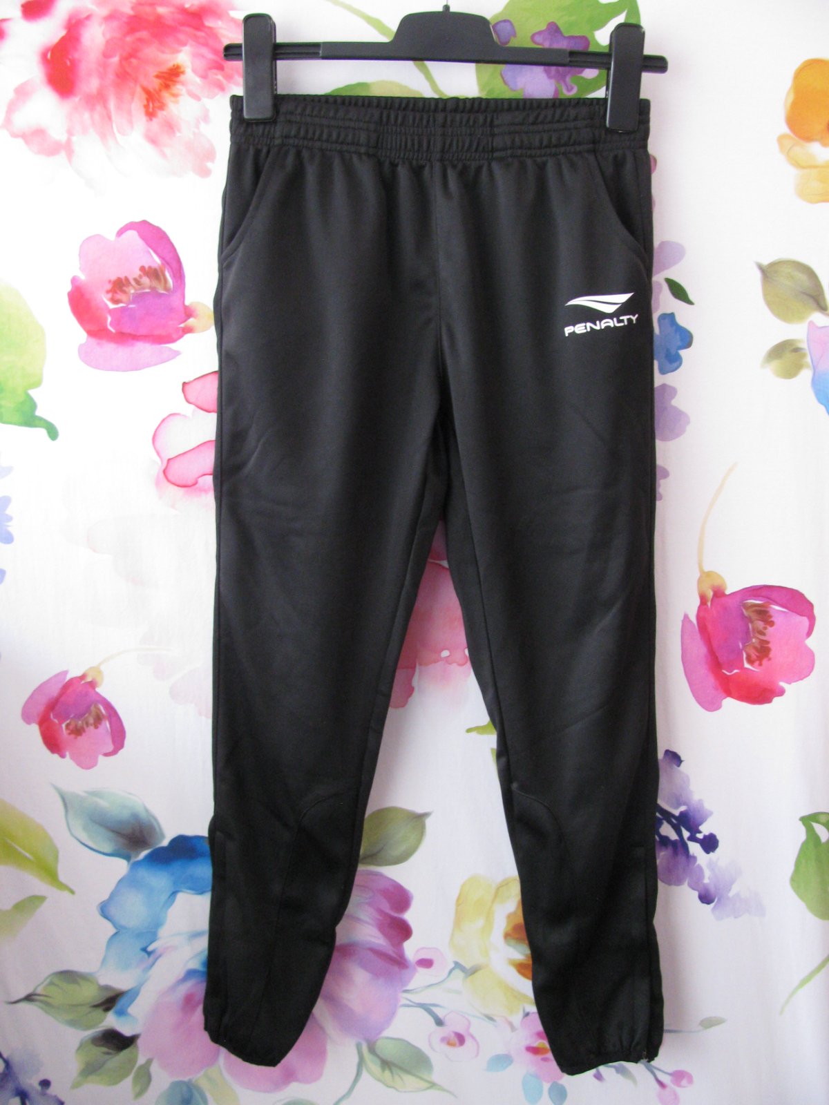 Chlapecké černé tréninkové tepláky značky Penalty, v pase guma a šňůrka, boční kapsy, pružné konce nohavic s krátkým zipem na odepnutí, logo, 100% polyester. Tepláky jsou nenošené, jen jednou vyprané.