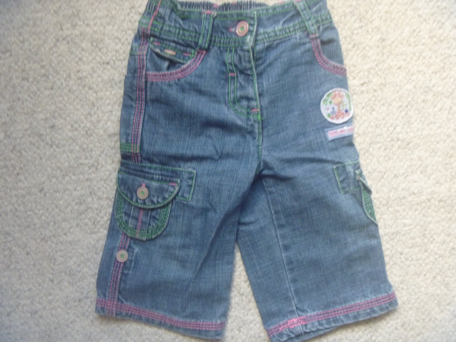 Prodám rifličky pro holčičku, zapínání na jeden knoflík, v pase guma i poutka, kapsičky, obrázek u levé kapsičky, barevné štepování, značka Next, velikost 3-6 měsíců (velikost 62-68), ve výborném stavu.