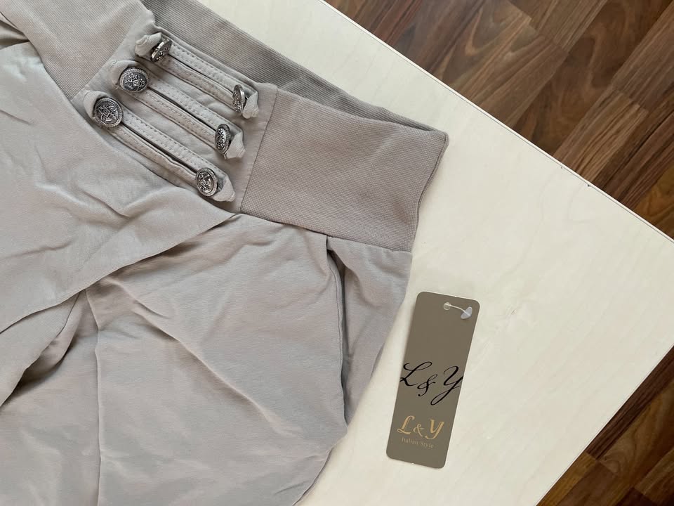 šk4. nabízím k prodeji tyto nové s visačkou kalhoty, vel není uvedena kupovány při S/M, měřte prosím, L and Y, Italian style. Barva béžová, chladnější odstín do šeda. Materiál jako teplákovky 95% bavlna, 5% elasten. Od ozdobného pasu s překlady na předním dílem překlady a do nich kapsy. Nové, bez vad, krásné