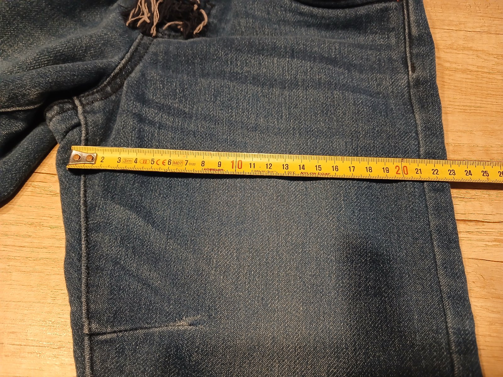 daruji pri koupi 1 věci z nabidky na fotce je džinovina světlejší než ve skutečnosti 71cm dlouhe na pravem koleni dira v dzinovine, pod ni je jeste latka - bez diry