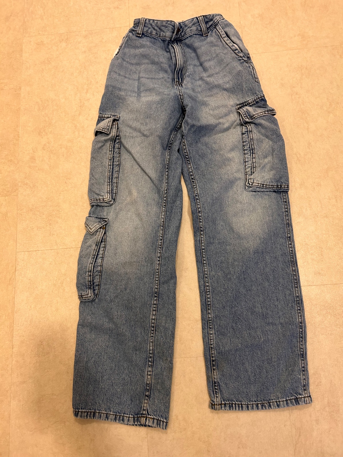 Nošené a prané rifle, bez vad. Džínové kalhoty s 5 kapsami z pevného bavlněného denimu. Mají zaoblené nohavice, které mají od sedla až dolů volný střih se spoustou prostoru po celé délce nohou. Sp...