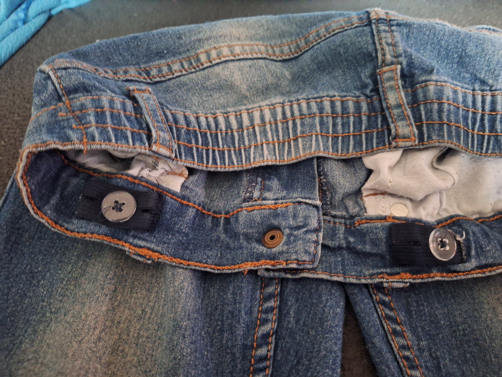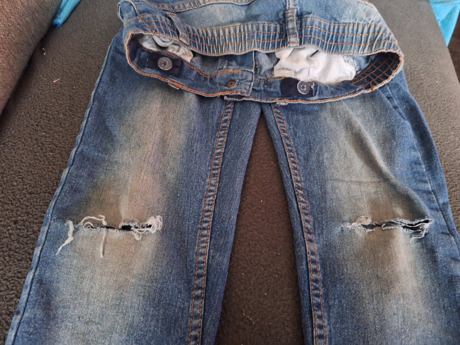 Chlapecké džíny značky Y.F.K. velikost 140. Známky používáníMnou roztřižená kolena