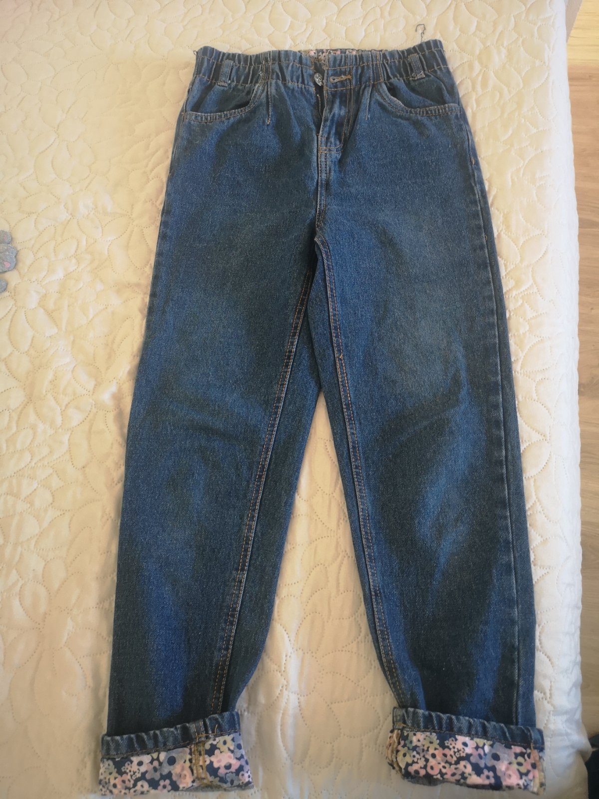 džíny jsou na několika místech moderně potrhané. jsou v dobrém stavu. v pase možno utáhnout dle potřeby. Rozměry: celková délka 81 cm, šíře pas 2x27 cm, nohavice od rozkroku 60 cm, délka sedu 22 cm.