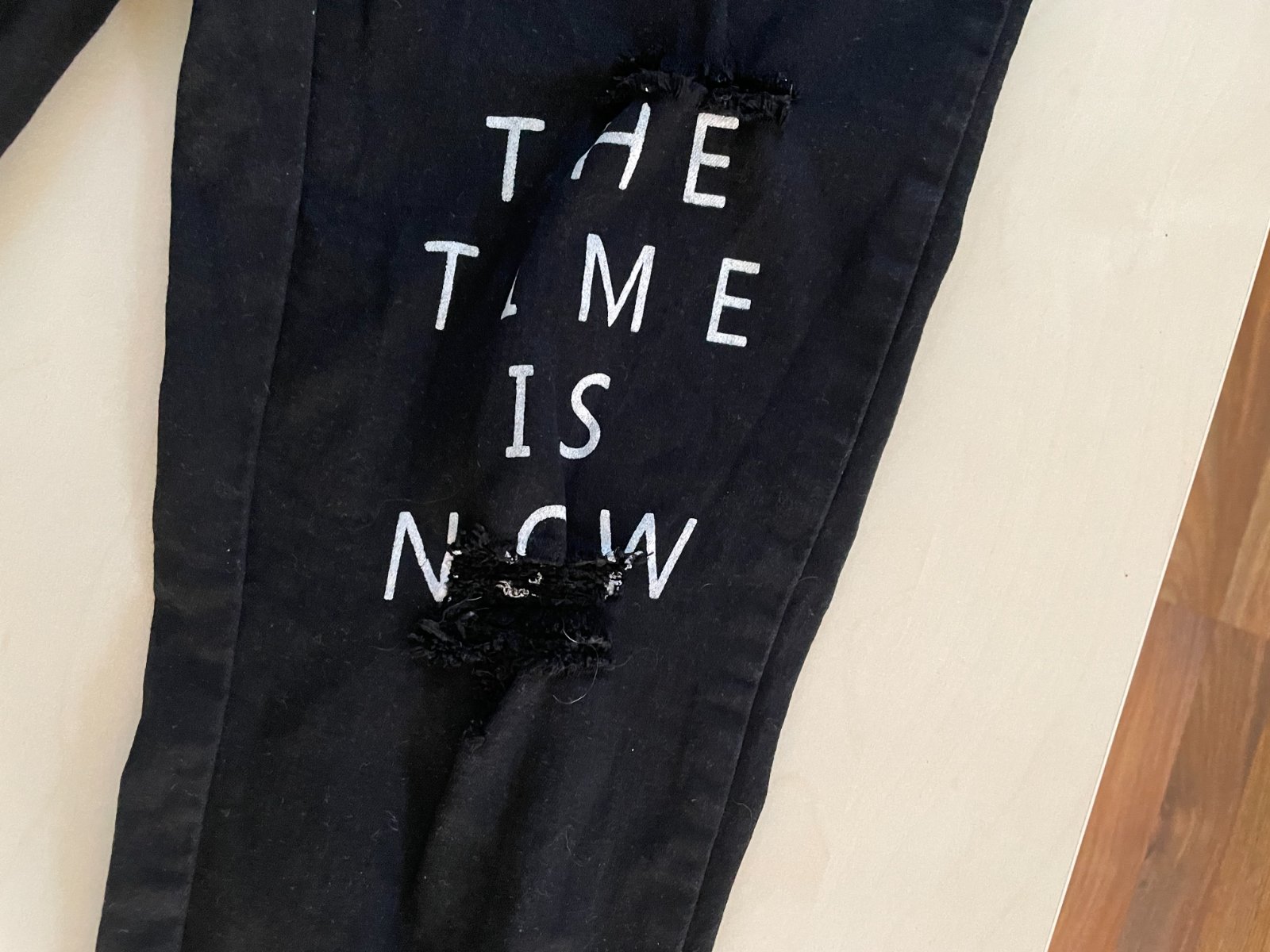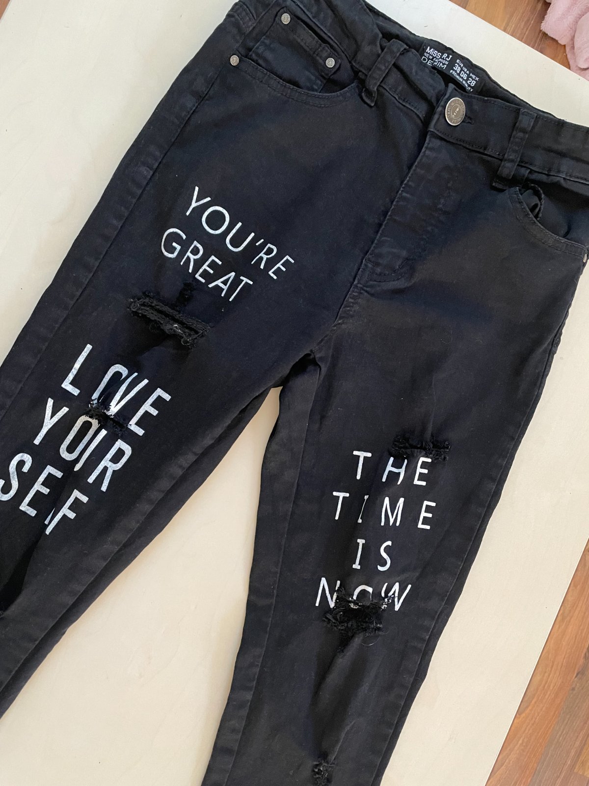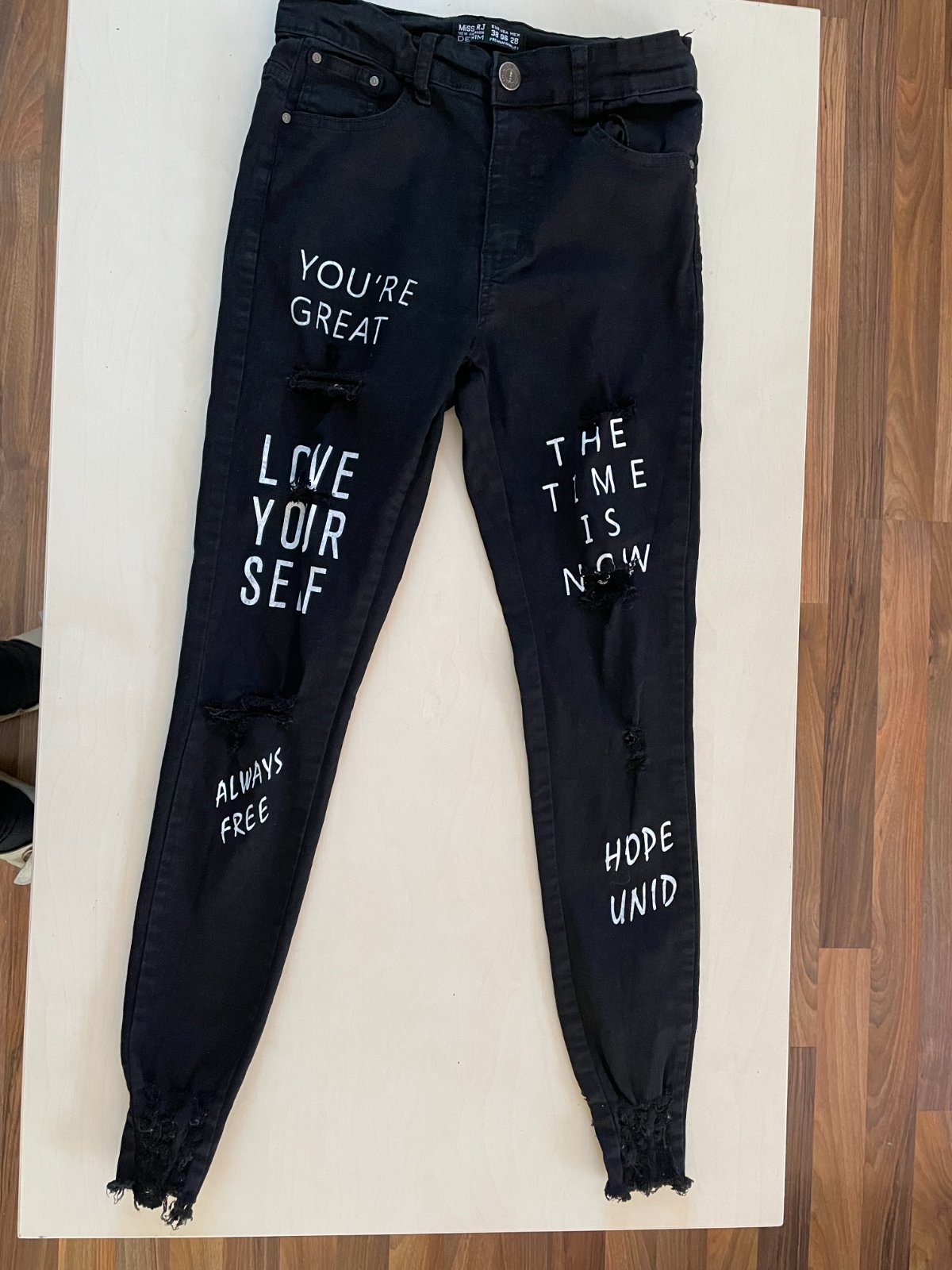 Drbané džíny s nápisy, vel M, spíše S a menší nebo